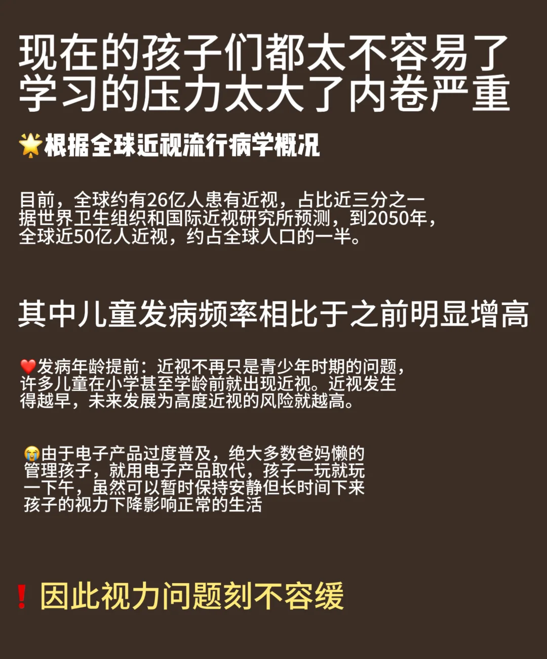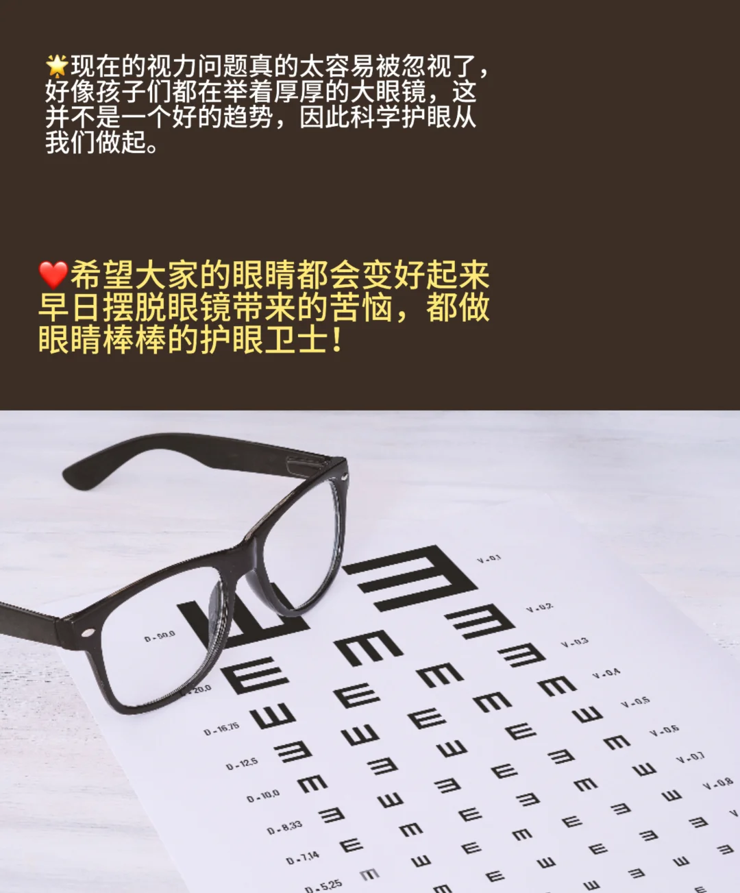 🌟现在的孩子压力太大,补课看书看电子产品,长期下来眼睛疲劳、紧张,刚开始或许只是干涩、发痒,家长没有及时注意,慢慢演化为视力下降,最终只能带上了厚厚的眼镜……