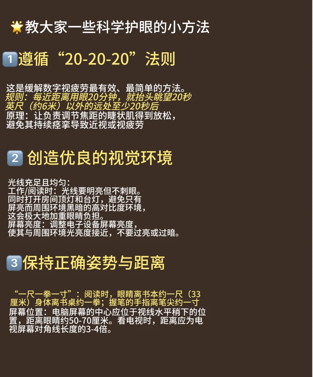 光线充足且均匀:工作/阅读时:光线要明亮但不刺眼。同时打开房间顶灯和台灯,避免只有屏幕亮而周围环境黑暗的高对比度环境,这会极大地加重眼睛负担。
