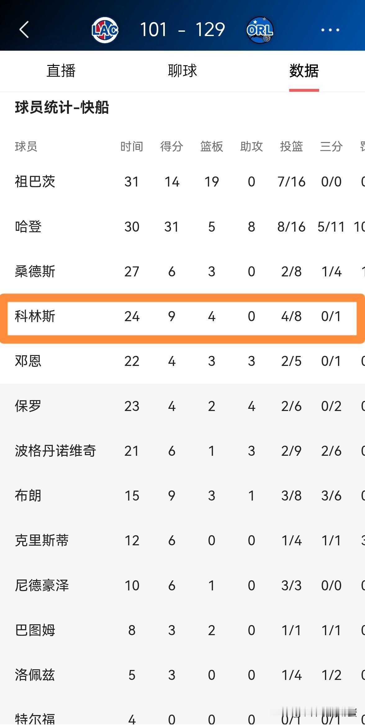 快船大将科林斯真是难堪大用!在今天快船客场以101:129惨败于魔术的比赛中,科林斯首发出战24分钟仅仅得到9分4篮板,他的场上正负值为-18。值得注意的是,在科林斯首发出场的六场比赛里,科林斯场均只能得到9.3分4.5篮板,他的投篮命中率为40.7%,其中三分球命中率更是只有可怜的13.3%。 总而言之,科林斯的表现真是让人大失所望,他完全没有打出应有的表现。