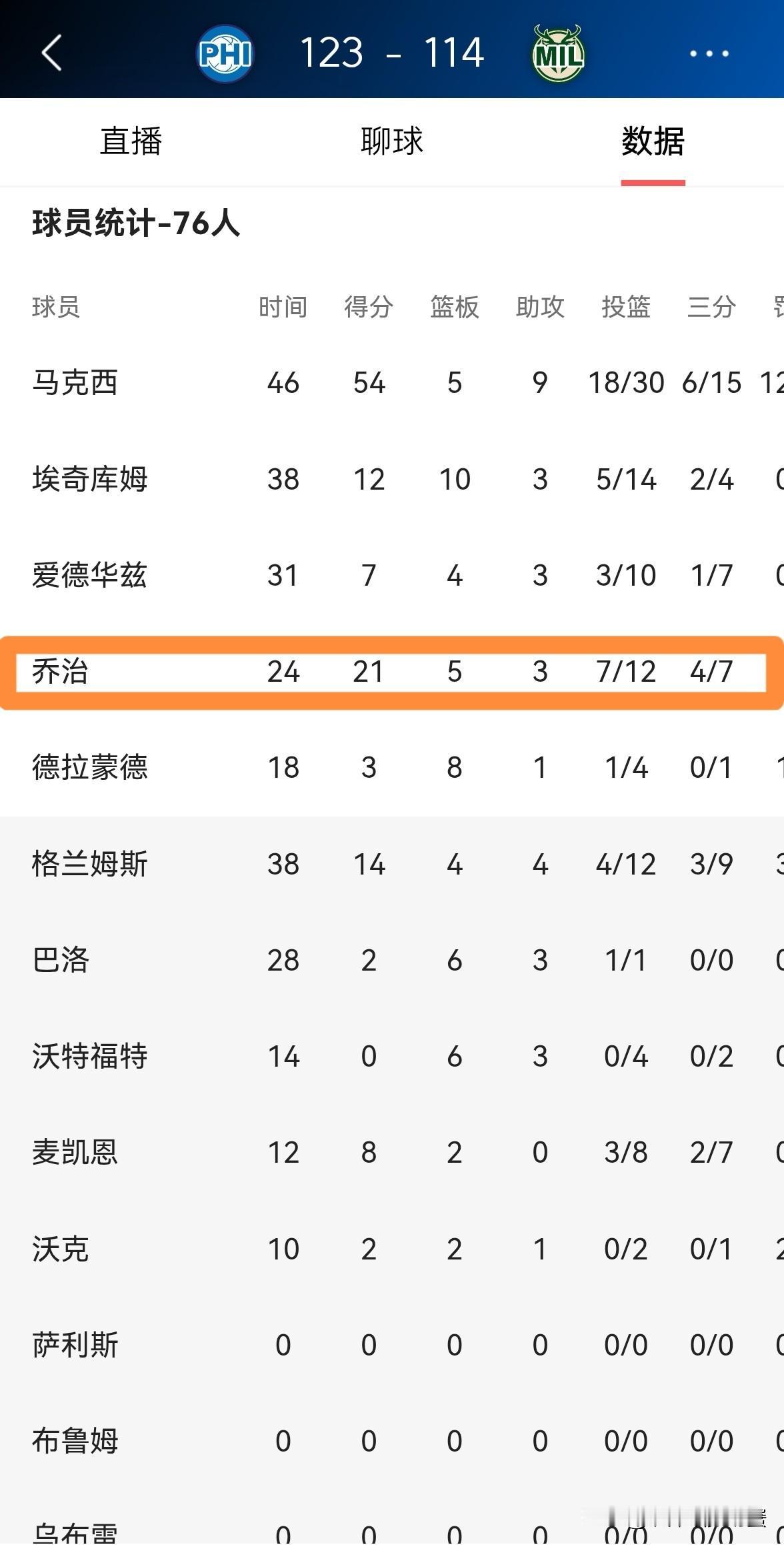 朋友们,NBA顶级3D保罗-乔治真的回来了!在今天76人客场以123:114力克雄鹿的比赛中,乔治在攻防两端都打出了无可争议的表现。 全场比赛下来,乔治仅仅首发出战24分钟,投篮12中7,其中三分球7中4、罚球4中3非常高效的砍下21分5篮板3助攻2抢断。 虽然乔治距离恢复到自己的巅峰状态还有一定的距离,但是他在今天的比赛中展现出了联盟顶级3D的风采。