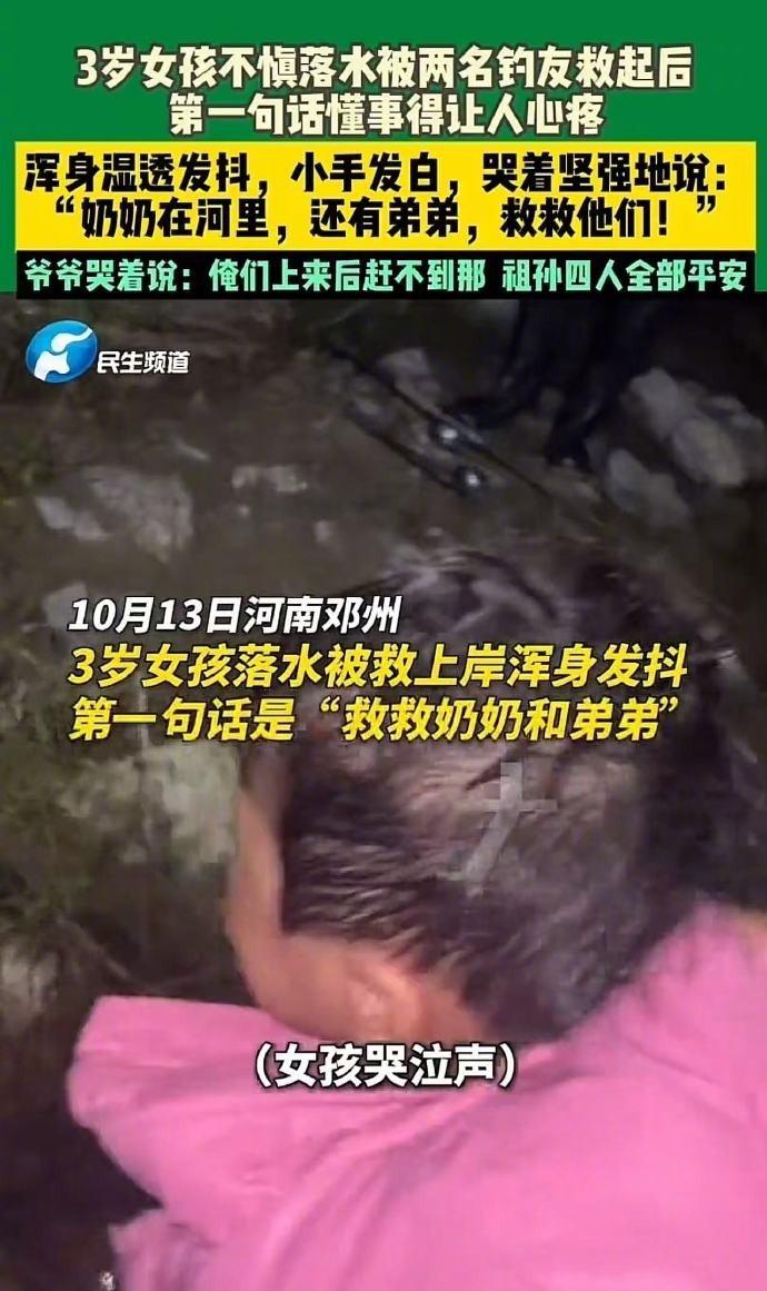 “这是几世修来的福气!”河南邓州,一名5岁女童不幸坠河,在急流中漂流三里多地后,竟被两位夜钓者用鱼竿成功救起。更让人动容的是,孩子上岸后第一句话是带着哭腔的呼喊:“救救我奶奶和弟弟!” 当晚7点40分左右,王佩和刘力正在下游陡峭的河岸边夜钓。黑暗中,他们隐约听到河面传来微弱的呼救声。打开头灯一看,竟是个小女孩在河心挣扎。河水湍急,岸坡陡峭,直接下水十分危险。紧急关头,两人急中生智,反复尝试用路亚鱼钩抛向女孩。终于,鱼钩挂住了她的衣服,二人合力将她拉回岸边。 惊魂未定的小女孩浑身湿透,脸色苍白,却马上哭喊着求助。王佩和刘力闻言心头一紧,立刻报警。事后得知,事发是女童的祖父带着祖母和姐弟四人,在上游过桥时意外落水。祖父母和幼孙在落水点附近获救,而这位5岁的小姑娘却被冲到了下游。 漆黑夜晚,急流之中漂流三里多路还能生还,可谓奇迹。而这个奇迹,既源于孩子强烈的求生意志,更离不开两位钓友的沉着与善举。小女孩获救后先想着亲人,这份懂事令人心疼;王佩和刘力于危难中伸出援手,用一根鱼竿挽救了一条小生命,更彰显了人间大爱。
