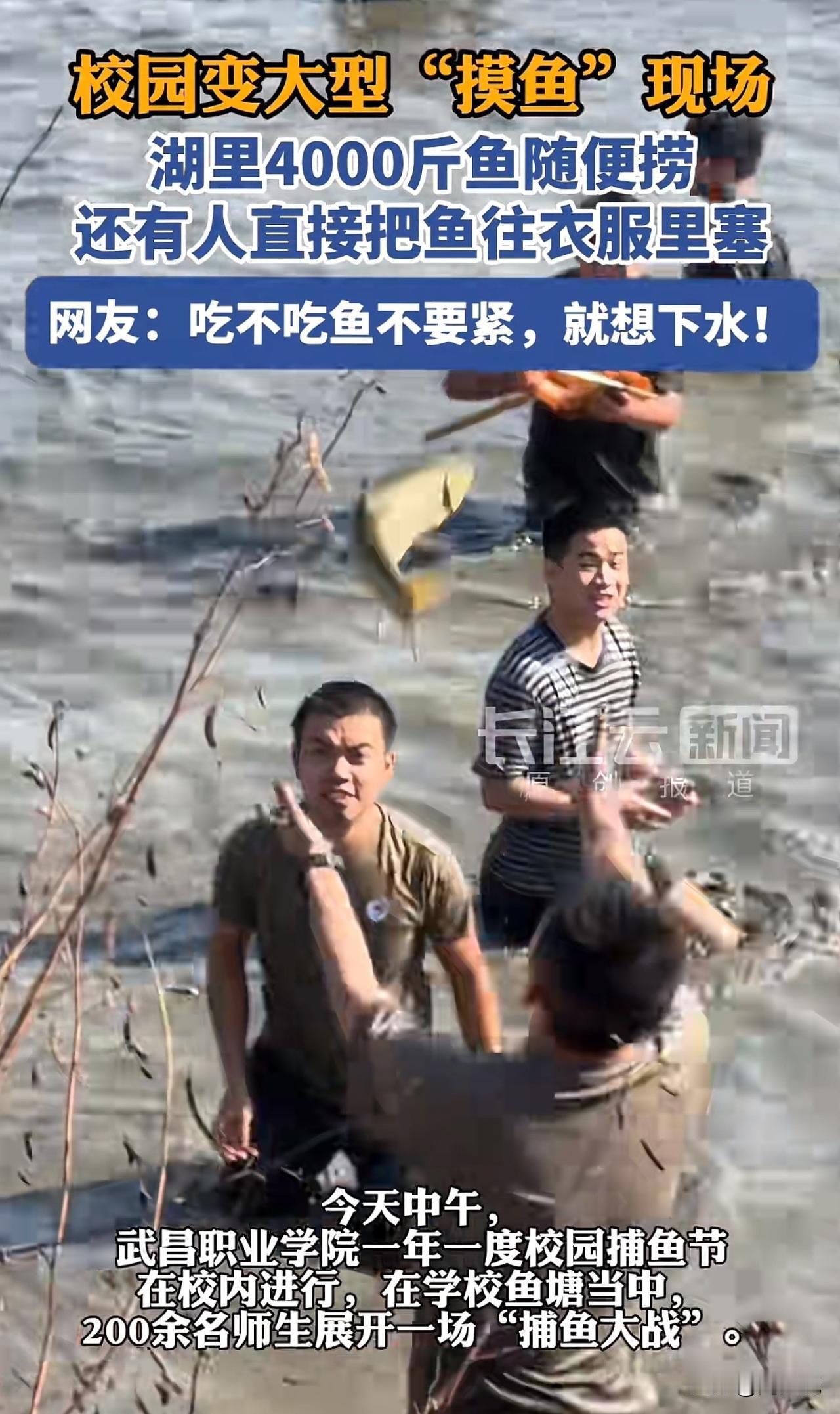 #武汉一高校4000斤鱼随便捞#太好玩了,校园变大型“摸鱼”现场!湖里4000斤鱼随便捞,有人直接塞衣服里,网友:快乐拉满! 近日,湖北武汉一高校彻底火了,湖里放养的4000斤鱼开启“随便捞”模式,瞬间变身为热闹的大型“摸鱼”现场。 同学们呼朋引伴冲进水里,有的举着网兜追着鱼群跑,有的徒手抓鱼忙得满头大汗,更有干脆利落的,直接把捞到的鱼往衣服里塞,浑身湿透也笑得开怀,校园里满是欢呼声。 这场接地气的活动引来了网友热议,有人调侃:“吃不吃鱼不重要,就想下水凑个热闹”! 还有人羡慕:“这才是校园生活该有的样子,活力满满”! 也有网友打趣:“求学校地址,我带着桶来报到”。 其实校园这场“摸鱼盛宴”,周少觉得不只是捞鱼那么简单,更是给紧绷的校园生活添了份烟火气。同学们在水里尽情撒欢,释放了学习压力,也收获了纯粹的快乐。 总而言之,这种贴近生活的校园活动,既接地气又有参与感,难怪能圈粉无数,这样的校园氛围,真的太让人向往了!#寻美三湘# #长沙新朋友#