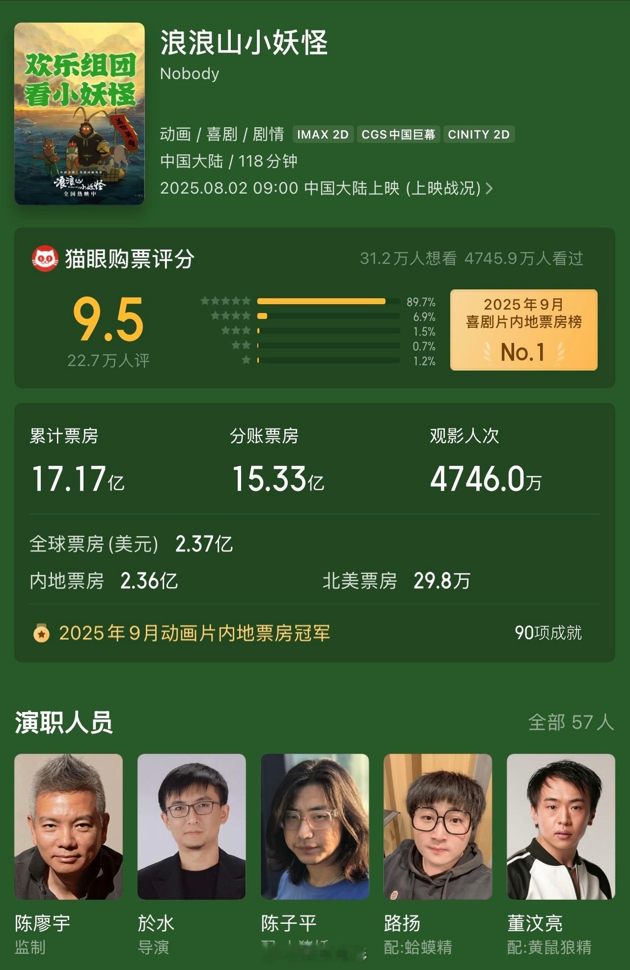 暑期档亚军🥈电影《浪浪山小妖怪》,流媒体已上线,截止今天累计票房17.17亿。我反复说《浪浪山》是今年院线的黑马现象级电影,无论放在暑期,还是全年。水墨画的质感也挺古风,我今晚打算重温下这部动画电影。