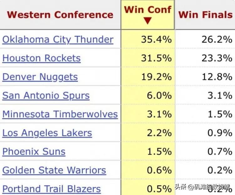 著名的数据网站Basketball Reference真是太看得起火箭了!据Basketball Reference预测,火箭赢得本赛季西部冠军的概率高达31.5%,而火箭的夺冠概率为23.3%,火箭被Basketball Reference视为西部第二强的球队,仅次于卫冕冠军雷霆。 在我看来,以火箭目前的阵容配置来看,火箭能够打进西部半决赛就已经是烧高香了。如果火箭的控卫问题始终无法得到解决,那么火箭很有可能会遭遇季后赛一轮游。