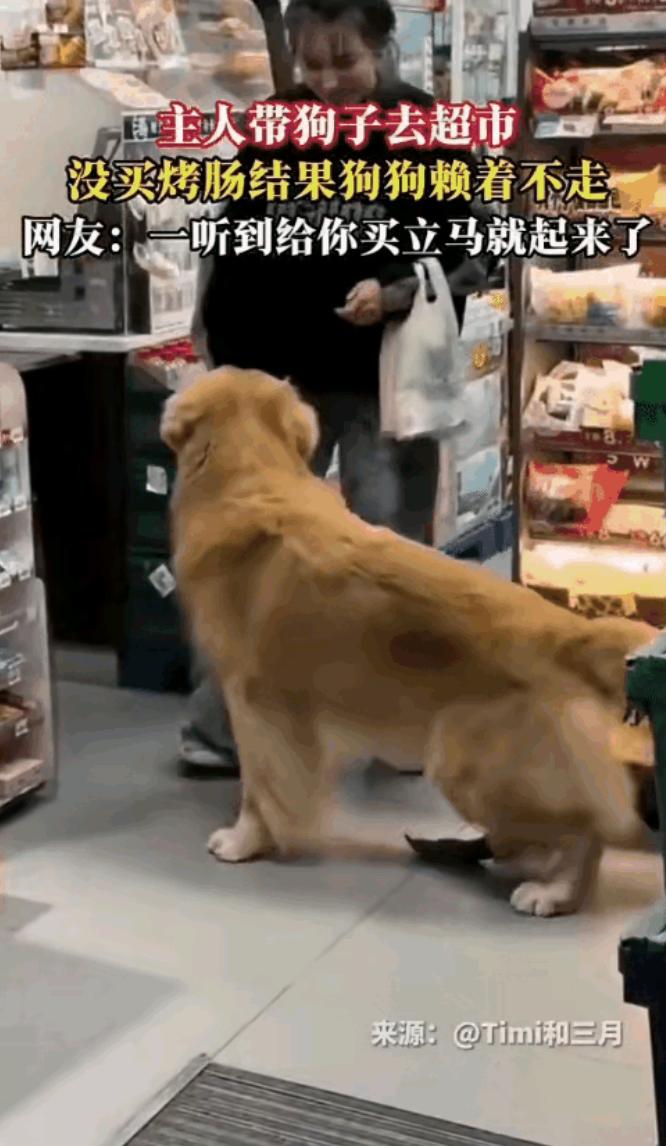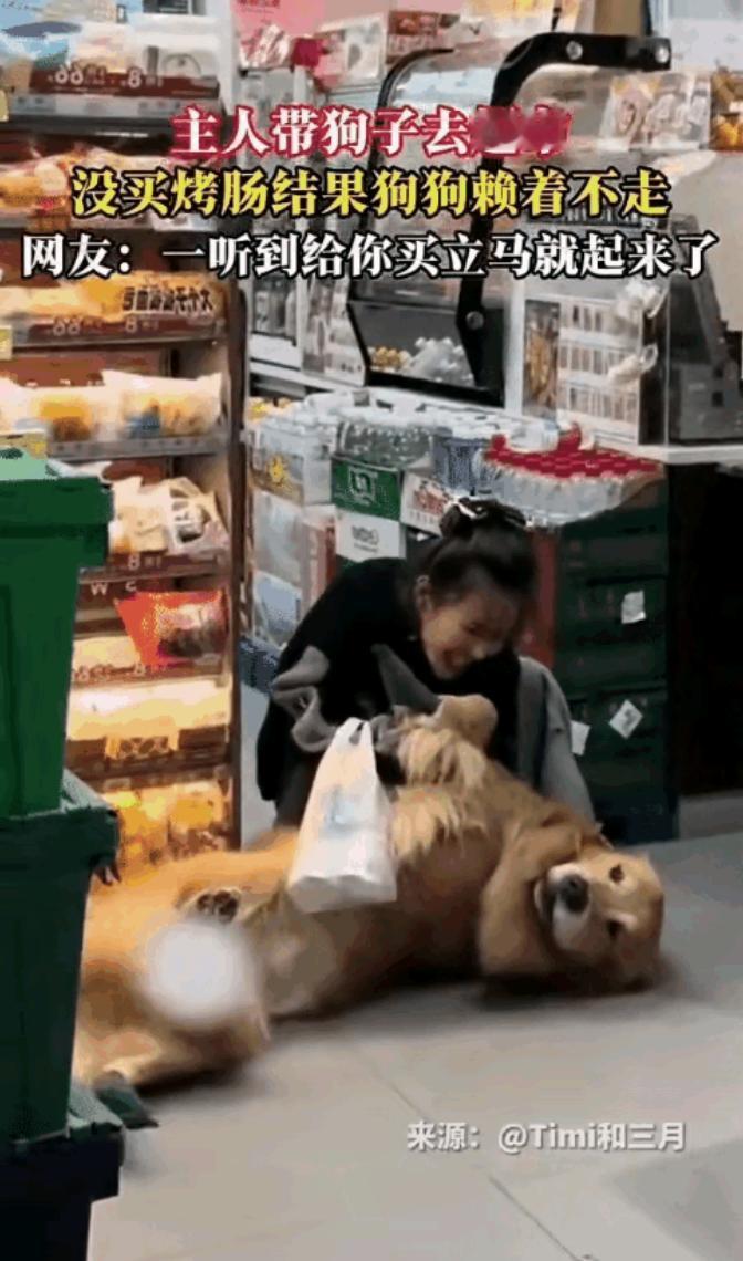 笑死了!一女子带着狗狗来超市买东西,进门时狗狗兴高采烈地跟在主人身后,尾巴摇得像小风车。可等主人付完钱要带它离开时,情况突然变了,金毛直接趴倒在地,四脚摊开不走了,原来,它以为进来是买烤肠吃的,发现主人没买,自己不高兴了 店里监控显示,女主人弯腰去抱,狗狗纹丝不动。她急得直跺脚,周围顾客都停下脚步,有人担心狗狗是不是身体不适。僵持几分钟后,女主人无奈叹气:买!给你买烤肠总行了吧? 话音刚落,刚才还瘫软的狗狗瞬间起身,欢快地围着主人转圈,尾巴摇得比进门时还起劲。围观的人们这才恍然大悟,忍不住笑出声 有网友说:我朋友家的大金毛每天散步都要去超市,买火腿肠,还知道要薯片,出超市门遇到人把火腿肠或者薯片袋子递给别人帮忙打开,不买也是赖在地上不起来,笑死个人的 很多人以为金毛傻白甜,其实金毛一点都不傻,它只是懒得跟你计较。大多数时候摇着尾巴装傻,是因为这样能换来更多的好处。你看前面那只耍赖要烤肠的狗,表面上是瘫在地上不走,实际就是在算主人啥时候妥协 而这些毛孩子看似在耍赖,其实展现了它们独特的思维方式。它们记得每次去超市就能获得美味零食,于是形成了条件反射。这种“小聪明”背后,是它们对生活规律的观察和总结