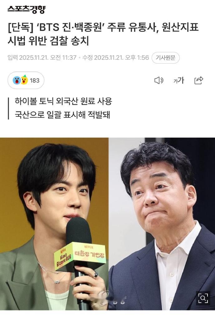 “BTS 金硕珍·白钟元”投资的酒类流通公司因违反原产地标识法被移送韩国检方防弹少年团成员Jin(金硕珍)与The Born Korea代表兼艺人白钟元共同投资的农业公司,因涉嫌违反原产地标识规定,被移送检察机关。据确认,国立农产品质量管理院忠南支援礼山事务所近期已将“白雪道家”(原礼山道家)法人及一名相关人员,以违反原产地标识法嫌疑移送至大田地检洪城支厅。销售由Genie’s Lamp制造的“IGIN Highball Tonic”系列产品的白雪道家,被查出在网上商城销售的“李子味”“西瓜味”产品中,虽然使用了外国产浓缩液(智利、美国产),却在主页和商品信息中统一标示为韩国国产原料。两家法人的代表为同一人,Jin和白钟元共同投资成立了公司,其中制造由Genie’s Lamp负责,流通由白雪道家负责。对此,有人提出了举报。举报人在举报状中写道:“金硕珍作为具有世界性影响力的艺人,对于其投资持股并参与成立的法人发生原产地标识法违规疑惑一事,不论法律责任是否存在,都应沉重看待其道义责任。”农管院忠南支援礼山事务所表示:“只有在负责线上销售的农业法人所销售的产品中,水、酒精、糖类(含糖类加工品)、食品添加剂以外的所有原料均为韩国国产时,才可以将国产制造加工品的原产地统一标注为韩国国产。”若违反与原产地标识相关的法律,可能被判处7年以下有期徒刑或1亿韩元以下罚款。Genie’s Lamp与白雪道家于去年12月推出该产品,今年9月因原产地标示问题被指摘后,才迟迟修改为“在详细说明中标示”。