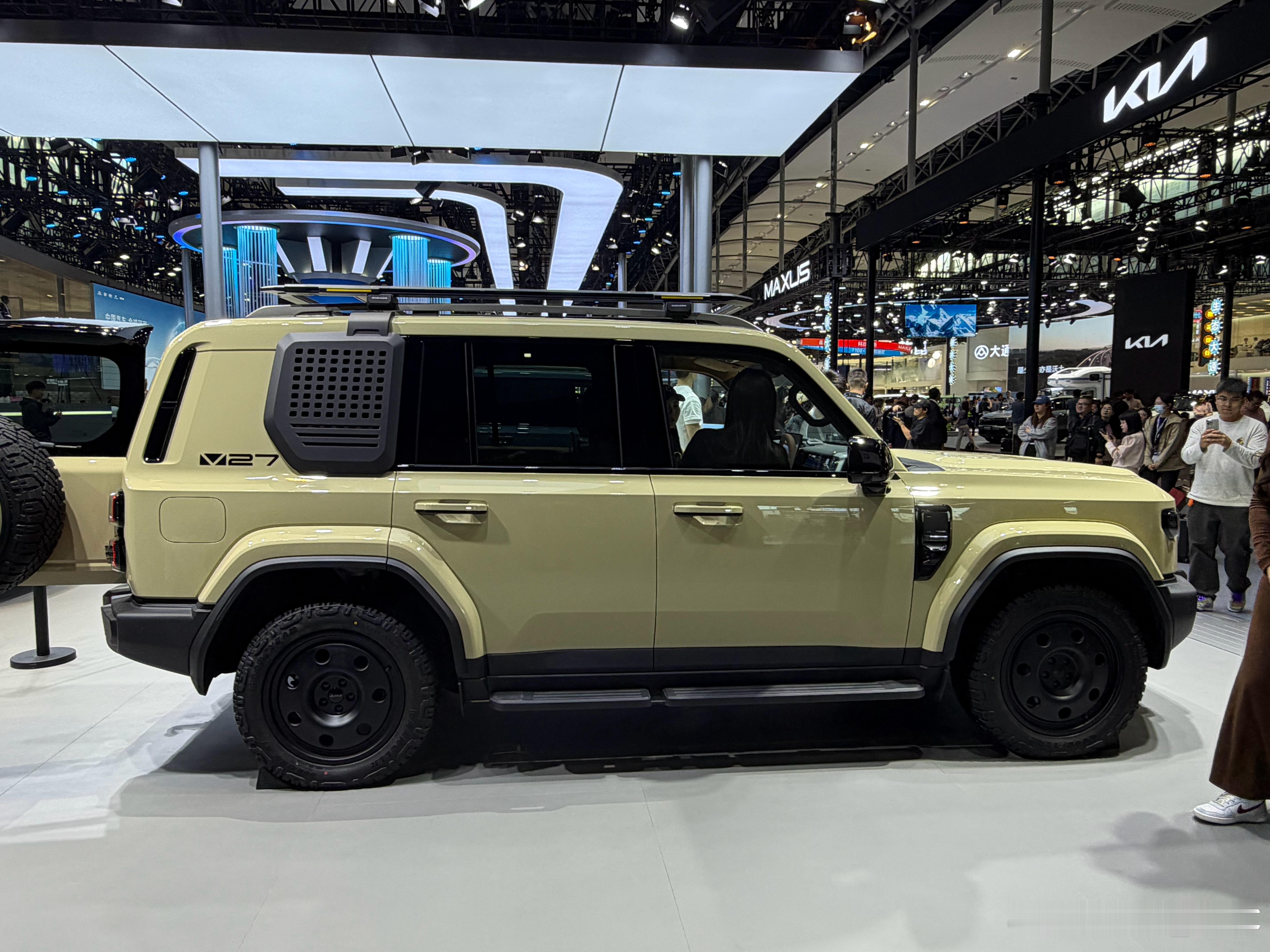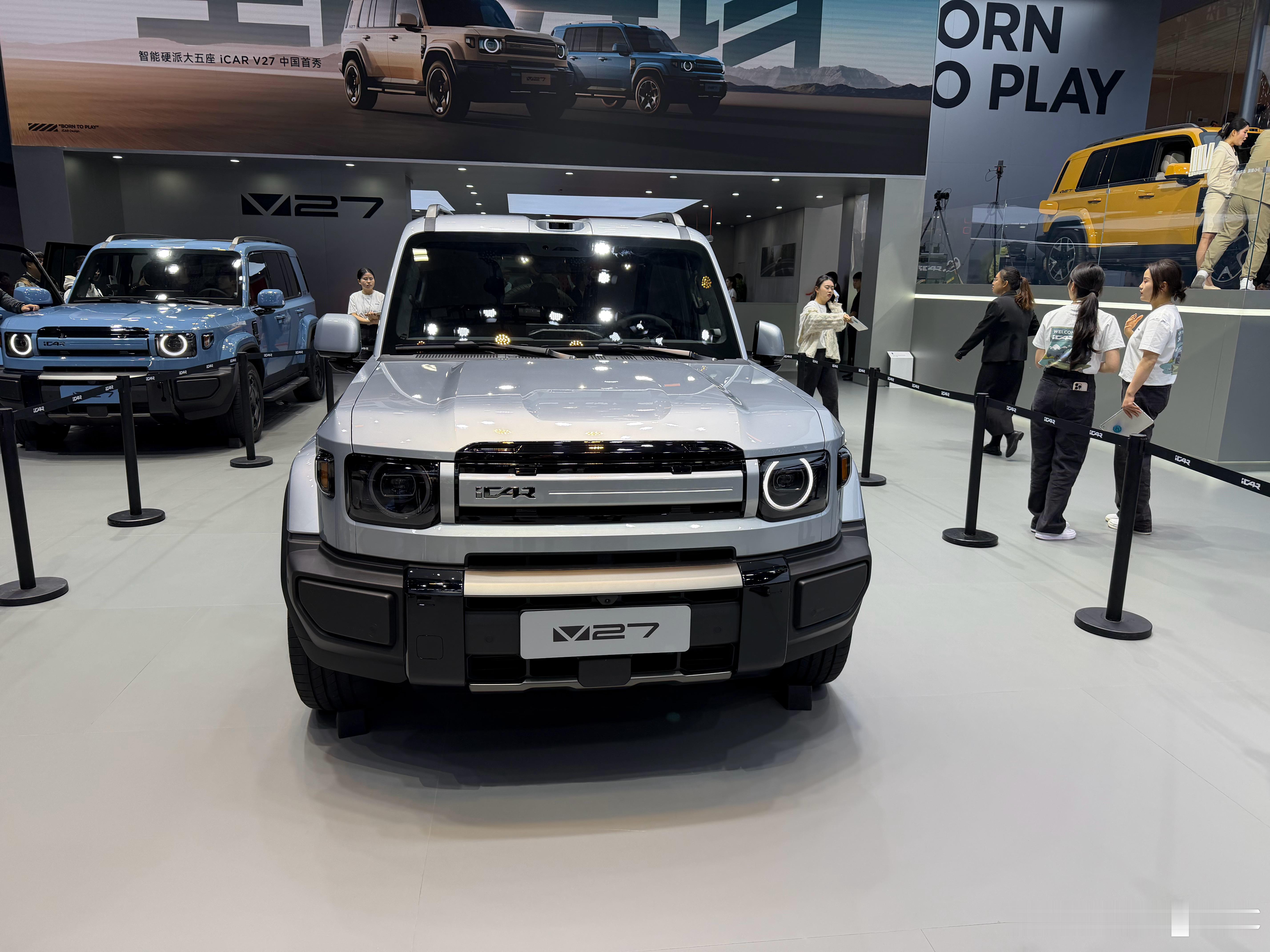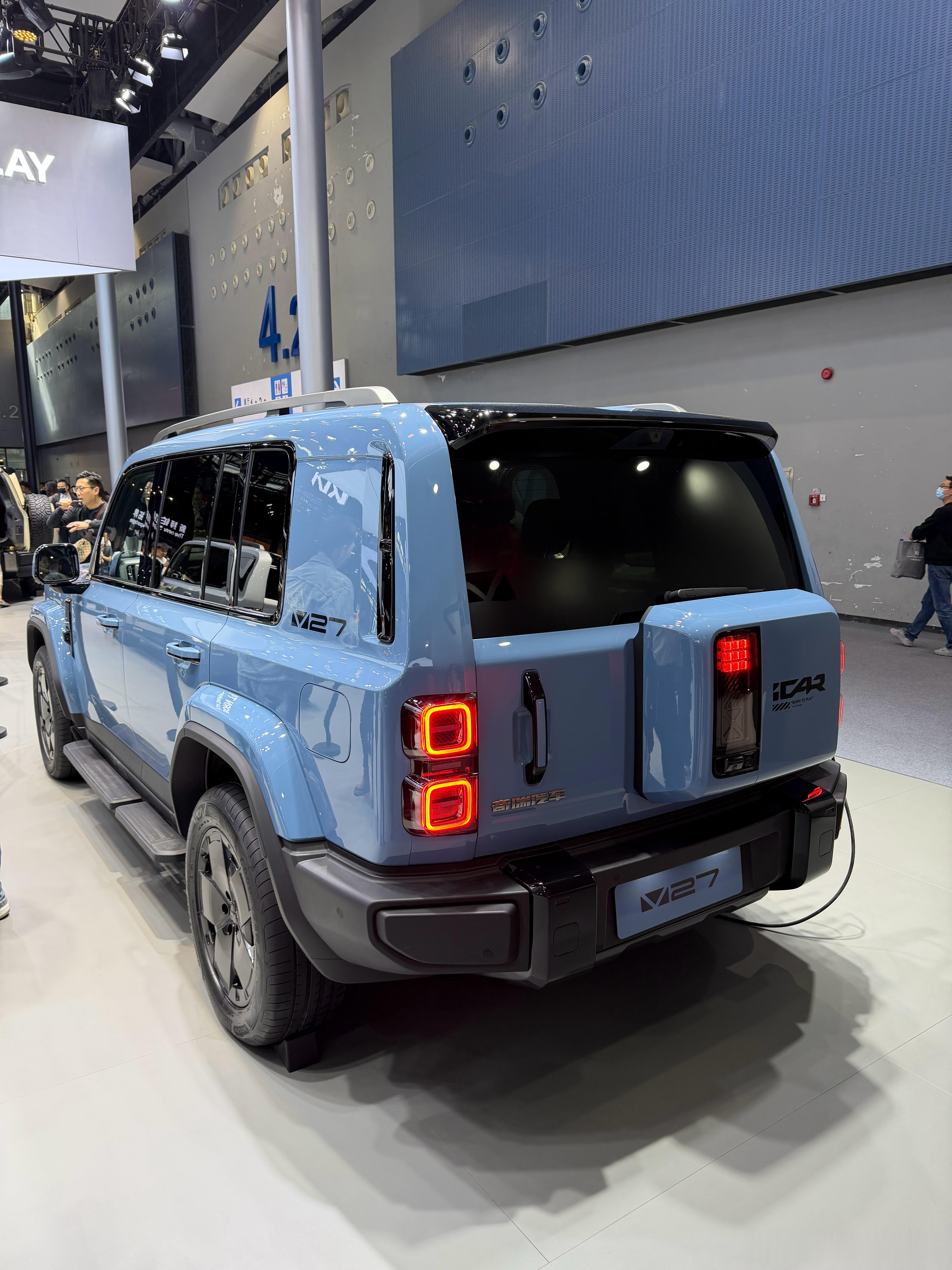 ICAR V27,实车造型真的挺好看,外观看着很熟悉,但又想不起来长的像谁?这是台增程车型,用的1.5T增程专用发动机,电池有34.3度电池,纯电续航200km+,综合续航可以达到1200 km+。优势造型好看,复古科技风,有全挂式备胎好评,适合喜欢方盒子又怕使用成本高的用户。