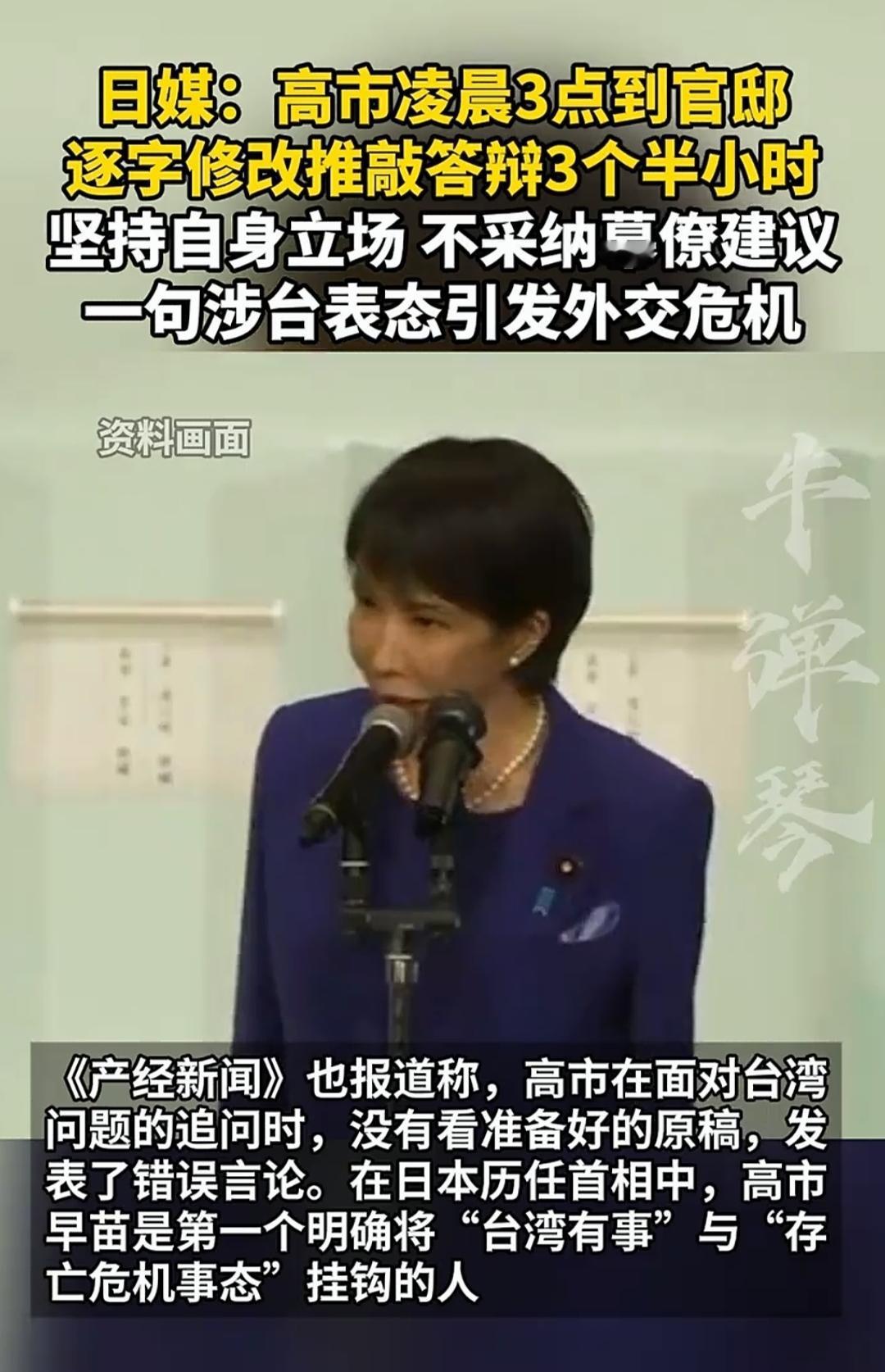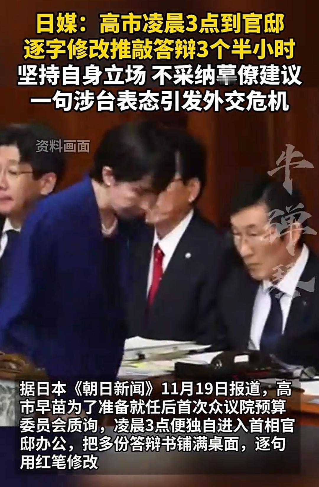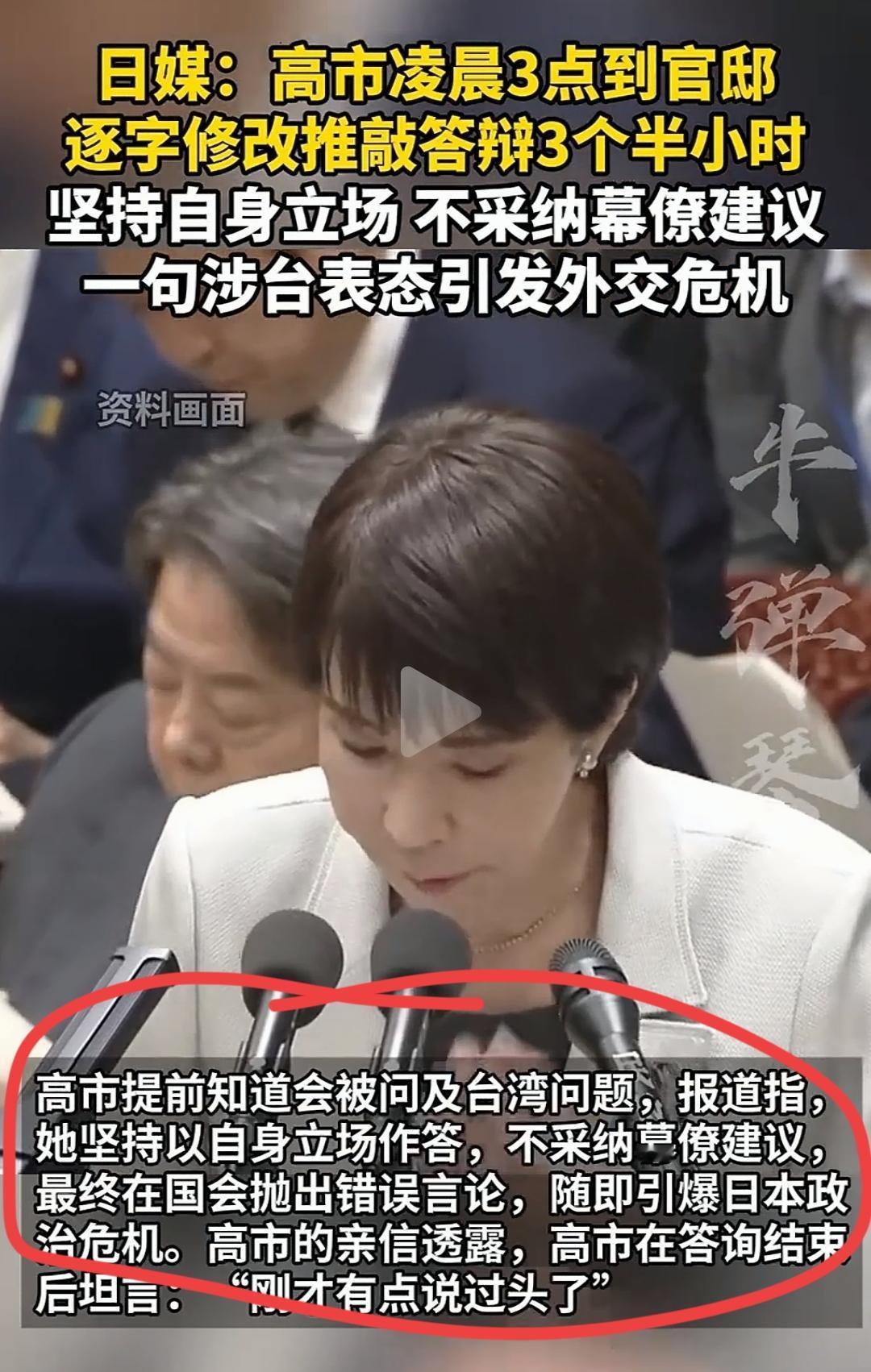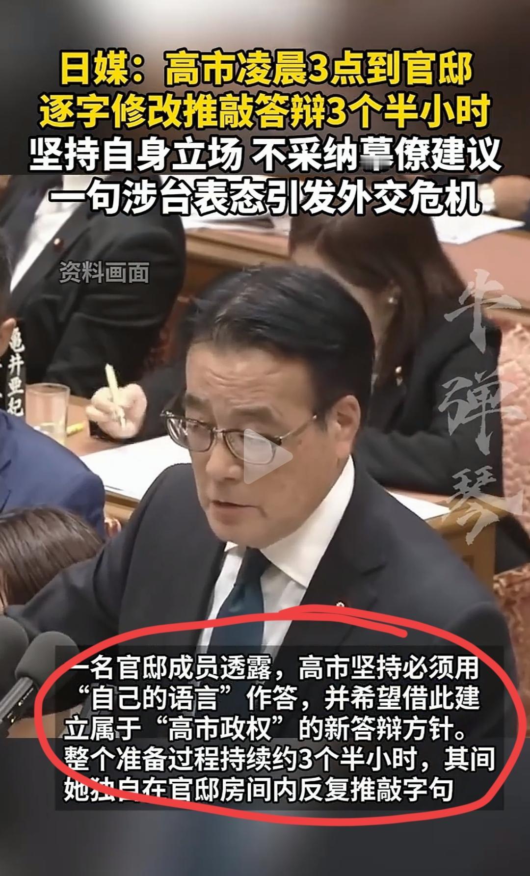 这是干什么? 开始准备和搞事毒苗做切割了吗? 所有搞出来的问题都是搞事毒苗一意孤行的结果。 这是她一个人的问题, 别拉上我们。 你看,幕僚们为她准备好的答辩内容, 她都没有采纳, 答辩时候她脱稿了。 讲完之后下来自己说刚才讲过头了。 这怎么能行呢? 饭可以乱吃,话不能乱说。 这不是搞事毒苗的态度, 这是全日本的态度。 要想解决, 收回发言并道歉。 至于是不是搞事毒苗不重要, 只要是日本首相就行。 点右上角关注我,我们一起去看这个魔幻的世界