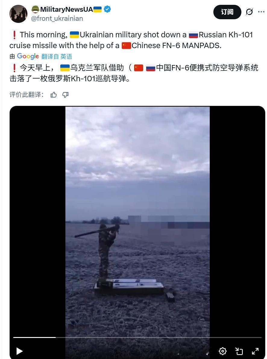 乌克兰军队用中国飞弩6(FN6)防空导弹击落俄罗斯KH101隐身巡航导弹,这些导弹怎么流入乌克兰的? 2025年11月19日上午,乌克兰第143联合训练中心“波多利亚”部队使用来源不明的FN-6便携式防空导弹,成功击落一枚低空飞行的俄罗斯Kh-101巡航导弹。操作人员仅有数秒(6秒左右)反应时间完成识别、瞄准和发射。 乌克兰军队发布了他们分布在战场各处的“机动单兵防空小组”的照片,一个班组4人,依靠军用吉普车机动,装备数量不明的FN6单兵导弹,以及1挺M2HB重机枪。 143联合训练中心“波多利亚”部队的facebook账号的详细描述其发布视频用中国飞弩6(FN6)单兵防空导弹击落了俄罗斯KH101隐身巡航导弹,这些导弹怎么流入乌克兰的?在平原地带大量部署这种防空小组,是否也是一道对低空巡航导弹的重大拦截防线? 乌克兰机动防空小组,4人一组 ------------------------------------ 我是真的不知道为什么有些人把亚音速巡航导弹这种90年代就列为新三打三防里的玩意儿吹成灭鳖神器的。 镜像问题,中国能击落战斧导弹吗