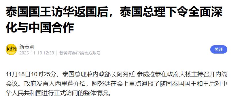 泰国开始转向了? 11月18日,泰国总理下达命令:全面深化与中国的合作。这是在泰国国王访华之后,泰国外交方面的首个重大决策,对中泰关系甚至对中国与东盟的合作都有很大的影响。 今年上半年,中国对泰投资金额已达220亿元,同比增长49%,电器电子、汽车、金属新材料这些领域成了中企扎堆布局的热门赛道。 泰国投资促进委员会也很懂顺势而为,直接抛出"税收减免+非税收激励"的组合拳,不仅允许外资100%持股,还给出最长13年的企业所得税豁免,连"长期居留签证"这种便利都安排上了。说白了,就是用诚意换投资,毕竟中国资本的涌入对泰国经济来说可是强心剂。 贸易往来更是热得发烫,今年1-5月中泰贸易总额飙到577.09亿美元,同比增长26.11%,虽然泰国对华贸易逆差达到7680亿泰铢,这恰恰说明泰国市场对中国商品的依赖度在加深,从电子产品到工业设备,中国供应链已经深度嵌入泰国经济脉络。 更关键的是RCEP带来的红利,泰国作为东盟的地理枢纽,依托曼谷港、林查班港本就能辐射6.8亿消费者,如今中老泰铁路全线贯通,陆海联运时效直接提升50%以上。 这意味着在泰国设厂的中企能把货物更快地运往整个东南亚,这种物流效率的升级可不是嘴上说说,而是真金白银的成本节约和市场拓展机会。 旅游业这块更是离不开中国市场的加持,今年1月到本月16日,泰国接待的外国游客里中国游客就有3946225人次,虽然外国游客总数同比下降7.18%,但中国游客带来的消费收入依然让泰国旅游部门笑开了花,毕竟中国游客的消费能力在全球都是出了名的。 旅游业是泰国经济的重要支柱,在其他客源国增长乏力的情况下,紧紧抓住中国游客这个"金主"自然是明智之举,对于泰国的经济基本面是有着不错的促进作用的。 开泰研究中心把今年泰国的GDP增长率预测从1.5%上调到1.8%,虽然这个数字不算惊艳,但能在国际贸易形势复杂的背景下实现增长,对华合作的贡献功不可没。 而中国对泰投资的增长直接拉动了当地就业和产业升级,中泰铁路这样的大型基建项目更是能带动沿线经济发展,这些实实在在的好处,泰国政府心里跟明镜似的。 而在泰国国王访华之后紧接着推出深化合作政策,也体现了双方政治互信的升级。在区域合作中,政治层面的共识往往是经济合作的前提,现在中泰从投资、贸易到旅游都形成了良性互动的循环,中国需要泰国这个东盟支点扩大影响力,泰国则需要中国的资本、技术和市场来提振经济,这种各取所需的合作模式,自然能越走越远。 虽说这世上没有永恒的盟友只有永恒的利益,但中泰目前的利益契合度,显然是达到了前所未有的高度,且短期内看不到要下降的趋势。