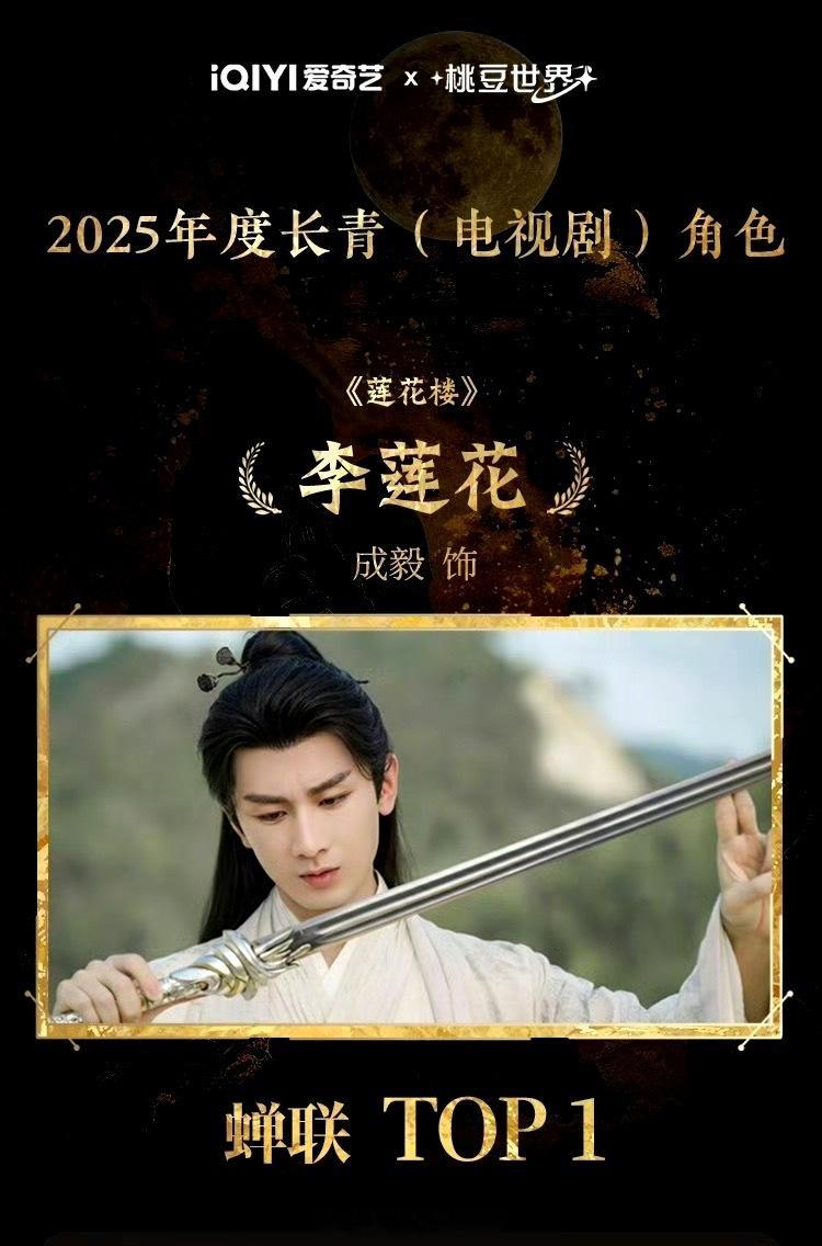 成毅王权富贵2025年度喜爱男性角色TOP1;成毅李莲花2025年度长青角色蝉联