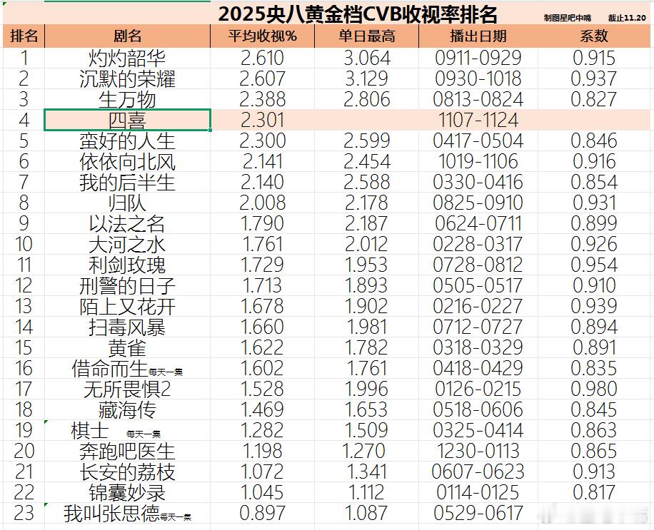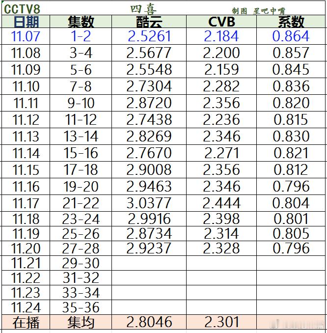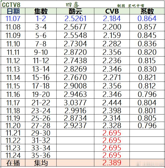 恭喜童谣 蒋欣 黄明昊《四喜》CVB集均收视率2.301上升至央八年度第四位。还有8集,后面CVB每集2.695就可以排名前三。
