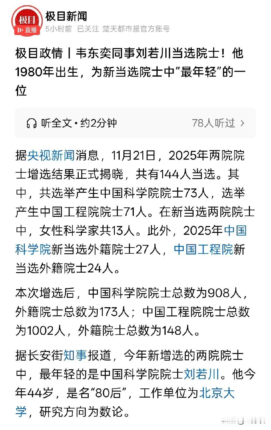 北京大学教授刘若川当选中国科学院院士,刘教授是当选院士中年龄最小的候选人,他出生于八十年代初,他还是韦东奕的同事。本来这件事跟韦东奕没有多大的关系,但是新闻媒体为了爆炸效应,特别用韦东奕的同事当选科学院院士作为标题,特意把刘教授跟韦教授拿出来做对比,十几年或更久以后韦东奕能当选中科院院士吗?大家拭目以待!