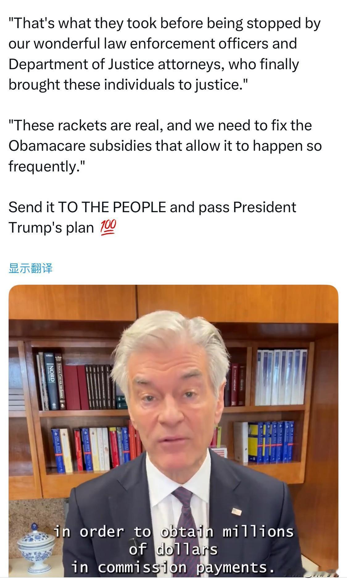 突发:美国医疗保险和医疗补助服务中心(CMS)主任梅赫迈特·奥兹(Mehmet Oz)刚刚揭露了奥巴马医改的大规模欺诈行为。是时候彻底改革整个系统了。 “司法部已对两名高管提起诉讼,联邦陪审团也已裁定他们有罪。这两名高管合谋通过欺诈手段,让美国人加入奥巴马医改保险计划,从而获取数百万美元的佣金。 “由于许多此类计划现在完全由像你我这样的联邦纳税人出资,因此很容易为那些甚至不知道自己已经拥有保险的人提交虚假申请。” “而且他们根本没有资格获得丰厚的补贴。这些无赖利用那些身陷经济困境、精神健康问题或毒瘾折磨的弱势群体,中饱私囊。他们坑害了我们所有人。” “1.8亿美元。” “这是他们在被我们优秀的执法人员和司法部律师阻止之前所窃取的金额,最终这些人被绳之以法。” “这些诈骗活动确实存在,我们需要改革奥巴马医改的补贴机制,正是这些补贴使得此类事件频发。” 把这个方案交给人民,通过特朗普总统的医改计划!