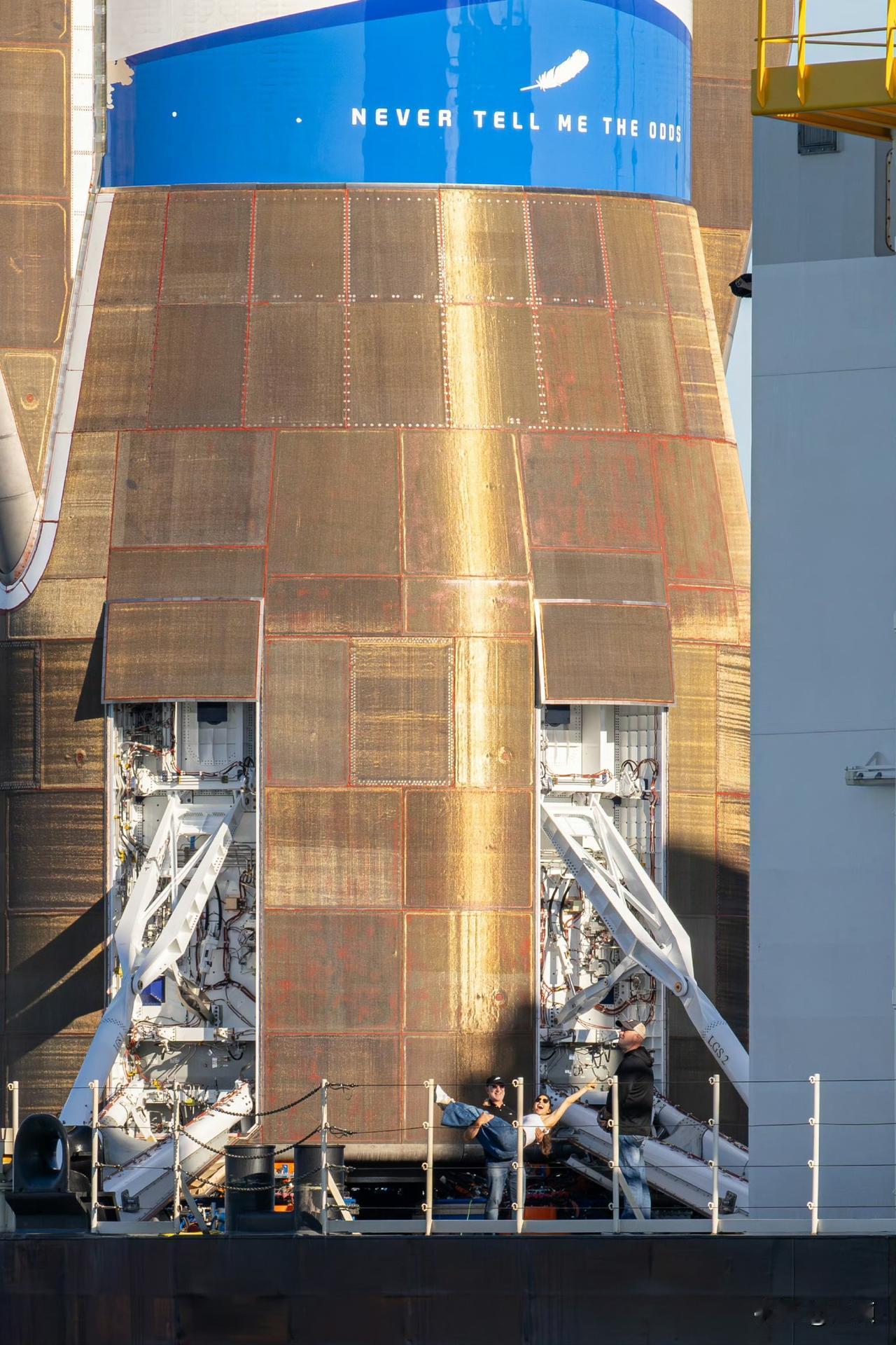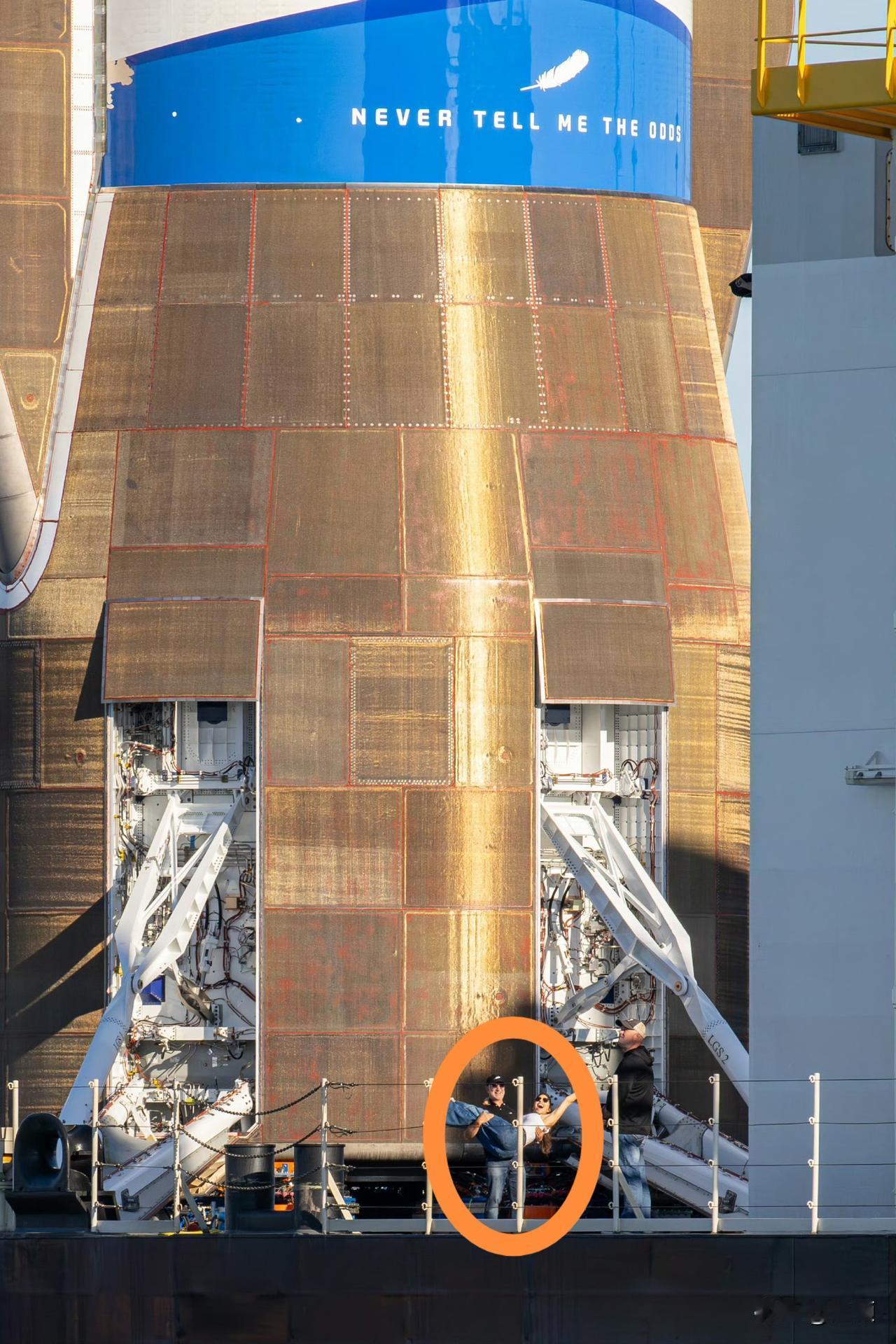 贝佐斯和他的爱人在新格伦火箭芯一级下合影! 谁能想到?站在写着“Never Tell Me the Odds”的新格伦火箭芯一级下,贝索斯都显得“娇小”了——这枚直径7米、长57.5米的“钢铁巨兽”,发动机舱比不少火箭整箭都宽! 7台BE-4发动机能爆发出1750吨推力,还能靠特殊热防护涂层和海上回收技术飞25次以上,一次能送45吨东西上天,简直就是能反复折腾的“太空卡车”! 这枚芯一级叫“Never Tell Me the Odds”(别告诉我概率),是蓝色起源为纪念首次回收成功起的名字,源自《星球大战》中汉·索罗的台词,表达了面对挑战的决心。