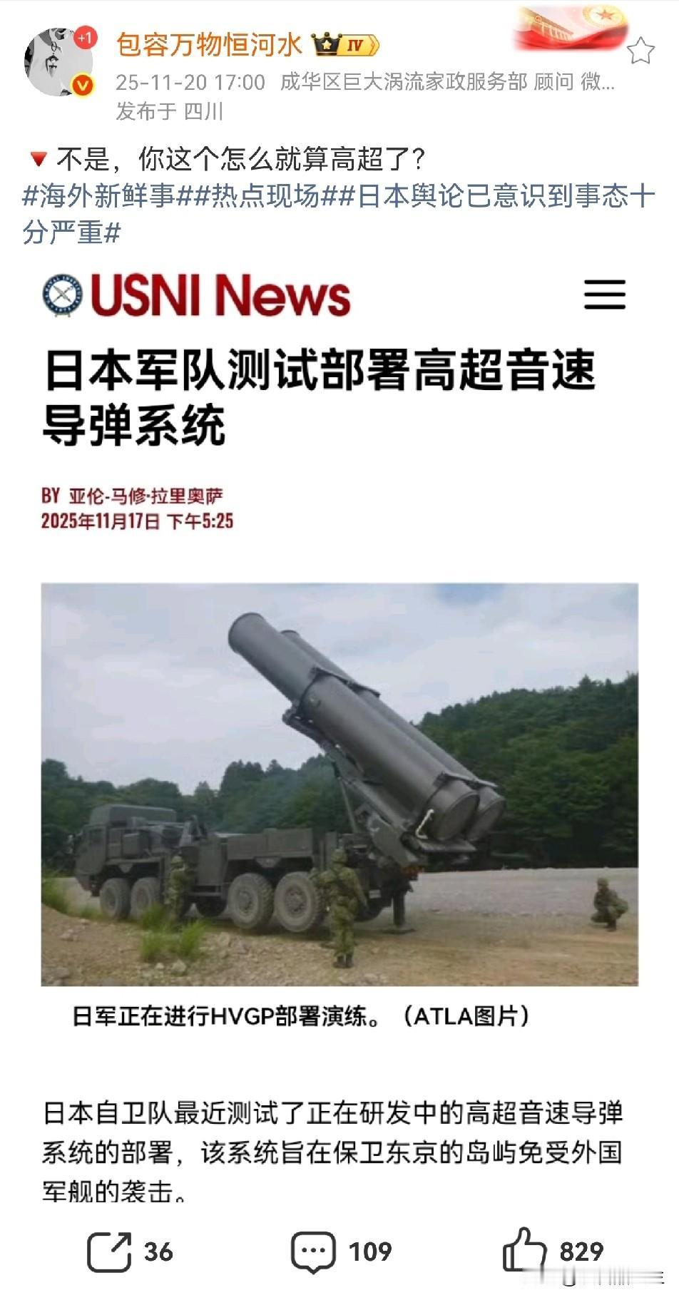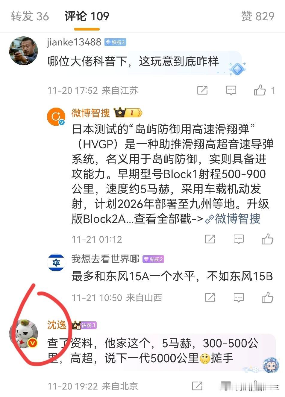 日本也有高超音速导弹了,不知道这两个大圆筒子里的高超音速导弹能打多远? 外媒报道日本也正在测试它们的高超音速导弹,据称可以打两千公里。一般人的印象中高超音速导弹都是那种锥体弹头的,不知道日本的大圆筒子里是什么弹头的高超音速导弹。 不过评论区里有明白人,说这种叫做“岛屿防御用高速滑翔弹”,速度约5马赫,采用车载机动发射。就连沈逸教授也回复了一下,说是5马赫,射程300-500公里,说下一代能到5000公里。 不管是500还是2000,都要等到2026年以后才能装备,不知道日本这么急于宣传这款导弹的目的何在,在我们9.3展示大家装备的时候,也秀一秀肌肉?恐怕只剩下挨打的份。