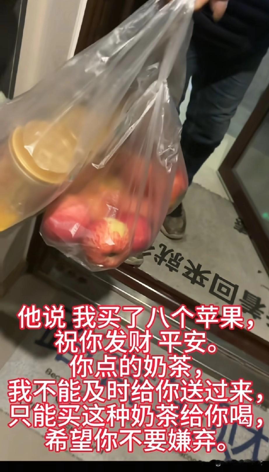 被感动到了!武汉,外卖员给顾 客拿外卖回来,发现车子被人偷走了。外卖员是个年纪有点大的大叔,尽管很委屈,他还是给顾客打去电话道歉。他说我车子被偷了,我不能及时给你送到了。你点的外卖多少钱?我赔你。 对面顾客是个女生,她听电话里外卖员还带着哭腔,接着就心软了。她说不用了送了,奶茶送你喝了。你赶紧去找车,该报警报警,我的外卖就当送到了。 可让女顾客意外的是,不久后,外卖员提着礼物来到了她家门口,外卖员买了一板奶茶和八个苹果,他显得有的羞涩,他说自己不知道女孩喜欢什么奶茶,就买了这样的,希望女孩别嫌弃。他说感谢女顾客的谅解,自己是专门赶过来道谢的。 女顾客问他的车子找到了吗?外卖员说还没有,自己是走着过来的,走了五六公里路。女顾客既吃惊又感动,她被大叔的质朴感动,自己明明受了委屈,还想方设法去弥补别人。 女顾客把视频发出去后,网友也说被大叔温暖到了。有网友说,大叔一看就是个体面人,他买的奶茶是大人买给小孩的,他是把小姐姐当孩子看了。还特意买了苹果,真是有心。 不过小姐姐心眼也好,主动提出不要赔偿,也是个善良的人,这是好人碰到一起了。 这件事被相关媒体转发后,事情也得到了圆满的解决。美团官方免费送了外卖大叔一辆车,还奖励了大叔2000块钱。不得不说,美团做的真不错,给他点赞! 对于这件事,你怎么看呢?