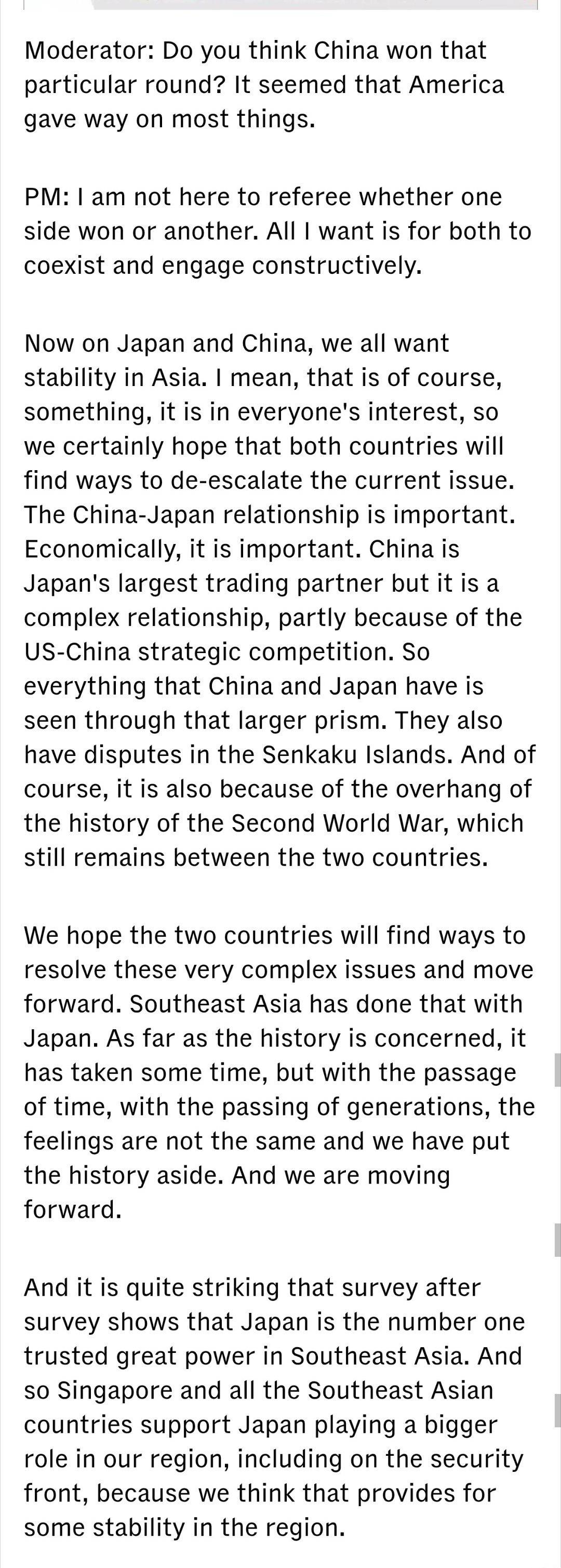 新加坡总理在彭博商业论坛上关于中日关系的看法全文。 这一次媒体确实没有断章取义,他确实说了: 调查显示日本是东南亚区域内最受信赖的国家之一,新加坡和其他东南亚国家希望日本在(东南亚)区域内,包括安全方面,发挥更重要的作用。 我不认同他的观点。 黄认为东南亚各国和日本在历史方面已经达成了和解,我不知道他怎么看待高市在马来西亚造访日军坟墓时,东南亚各国网民的怒骂。 新加坡是东盟的重要成员,但黄不能代表全部东南亚国家做这种发言。 黄是靠防疫等内政工作起家的人,他是外交领域的新手,这段发言违背了他前辈保持的一些基本准则。 哪怕在论坛这种场合,主持人提了涉及中美,中日的敏感问题,你也必须回答的时候。 一碗水要端平。 他的回答,撒水了。