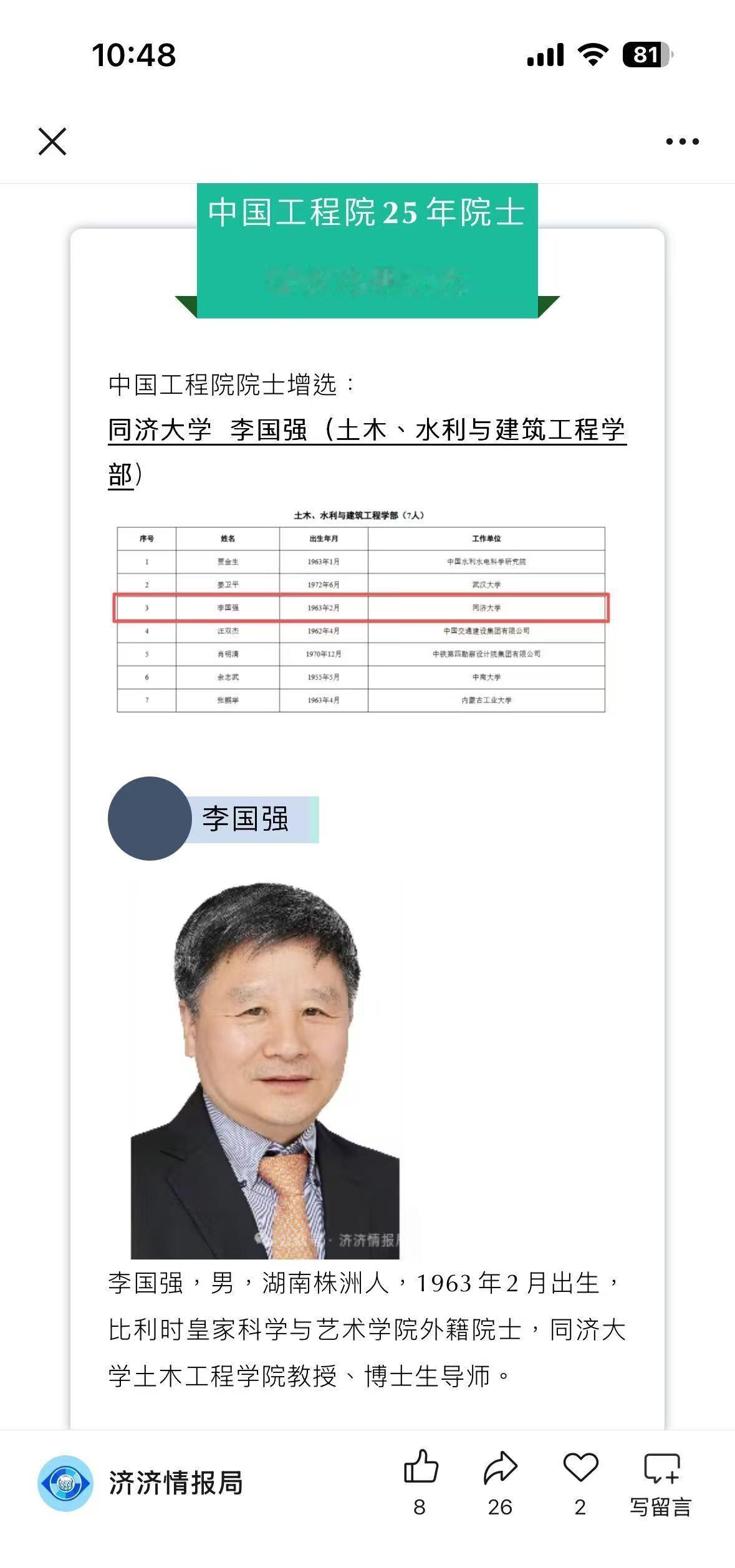 上周上课的时候老师说听小道消息说这次同济增选院士不是很理想,今天突然刷到增选的院士其实就是他自己,怪不得他这么关注