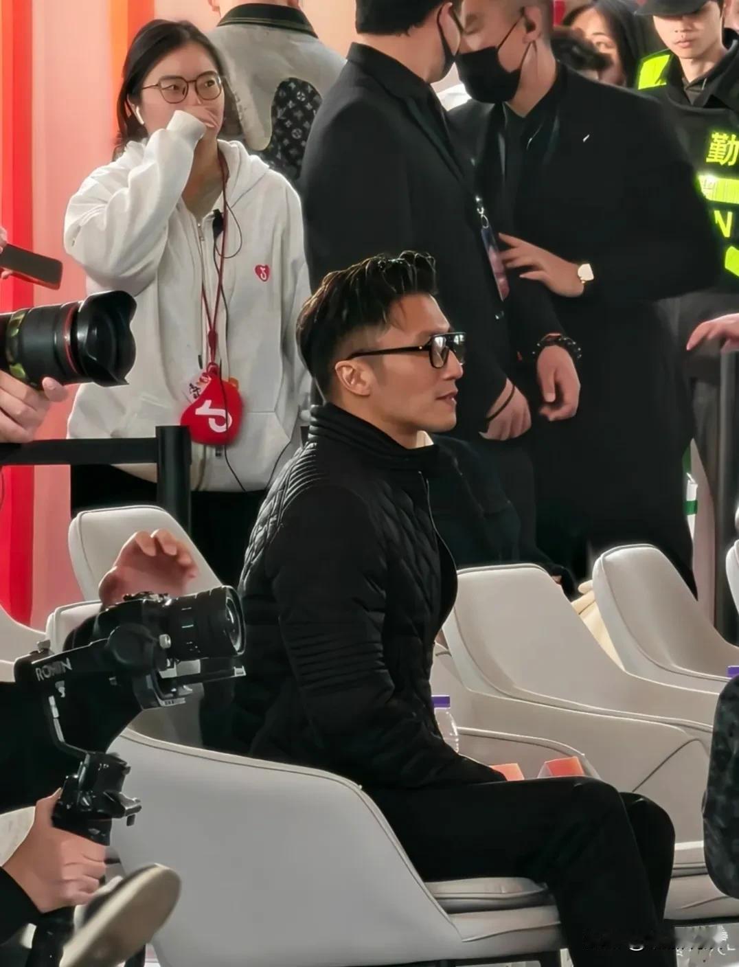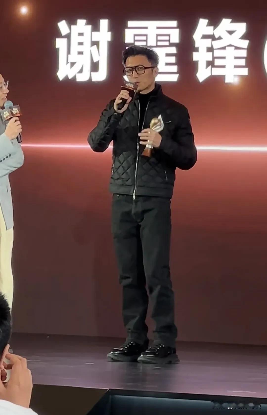 谢霆锋现身成都出席活动。 穿着一身黑色,戴着黑框眼镜,发型板正,身形很瘦,下颌线