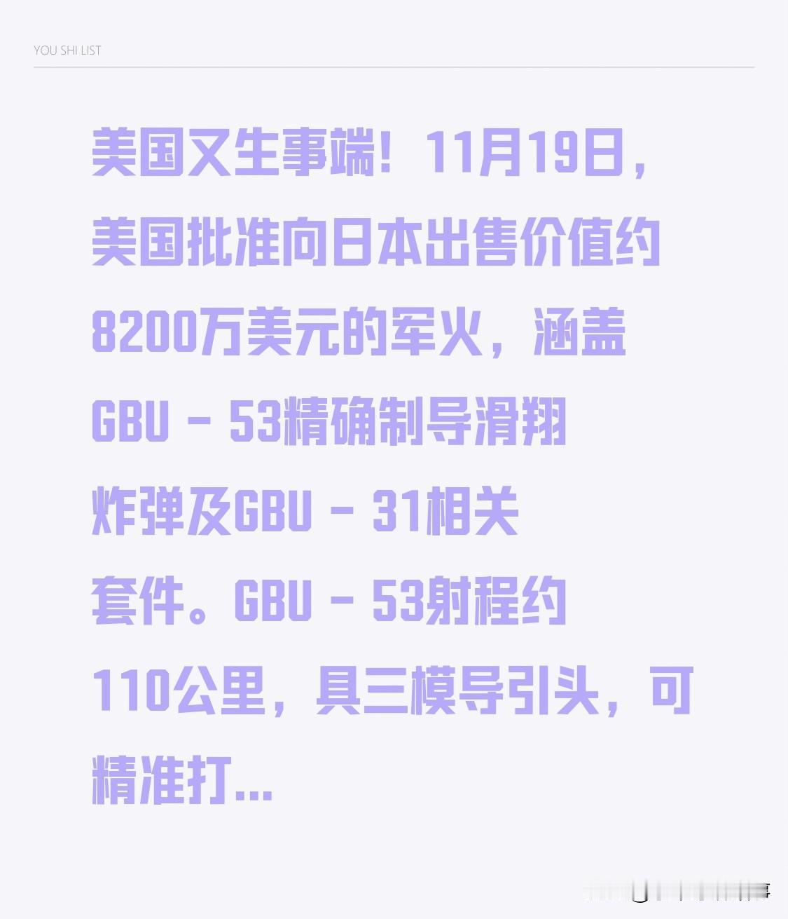 美国又生事端!11月19日,美国批准向日本出售价值约8200万美元的军火,涵盖GBU - 53精确制导滑翔炸弹及GBU - 31相关套件。GBU - 53射程约110公里,具三模导引头,可精准打击移动目标;GBU - 31套件使炸弹远程精确打击能力强且成本低。 这些装备适配日本空自F - 15J、F - 35等战机,美国称提升日应对威胁能力。但这是美日同盟危险举动,打破地区军力平衡,给周边添不稳定因素,令人担忧。