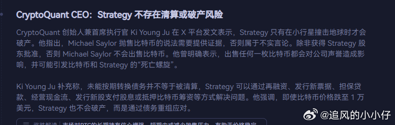 大饼再跌10% 就到微策略的持仓成本了,如果跌穿成本价,想象一下拿着65万枚没利润的大饼是啥感觉。。。关键是这玩意还卖不掉。只能看着大饼下跌。。微策略可以继续买,问题是买也买不起了啊。高位加仓买的部分已经亏损了。如果美股进一步下跌,大饼肯定还要跌。太可怕了,88000的现货我亏着了。感觉不妙,85000了,这玩意现在还看不到止跌迹象。