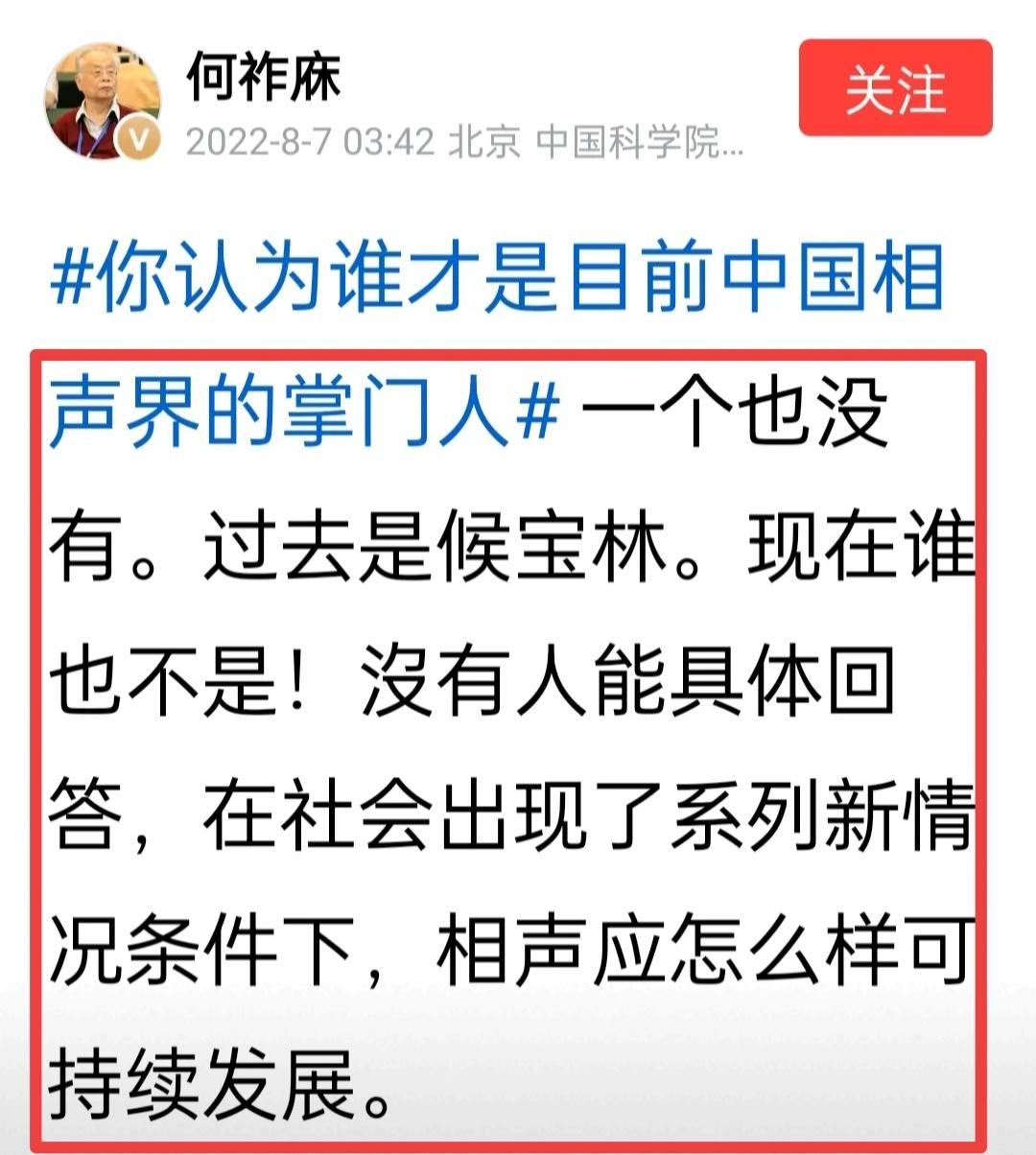 何祚庥老院士怒批姜昆,再谈相声发展。 谈到相声,自侯宝林先生之后,姜昆老师管理相声界几十年。众所周知,他追求的是高雅的相声,能教育人的相声。 那么何祚庥院士是如何评价姜昆的呢? 何老认为姜昆没有给相声界解决过什么大问题,这是何老对姜昆管理相声界的评判。 谈到相声的发展,何老院士认为侯宝林是当年相声界公认的大师,也可以说是相声的掌门人,如今应该没有人能达到他的地位了。此外,何老强调相声目前还面临着如何持续发展的问题。 相声未来朝哪里发展?这也是传统艺术面临的传承难题,随着互联网的发展,相声的视频传播较为广泛。传播的多了,大家也容易看腻了。观众需要更多的相声好作品,这也是对相声传承人的考验。