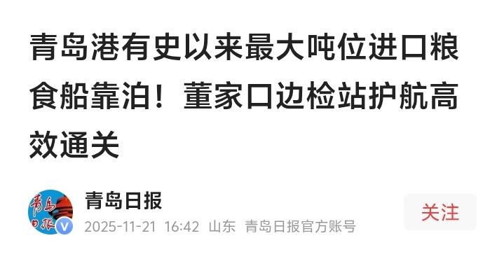 青岛港震撼一幕:8万吨黄金玉米破纪录靠泊!董家口边检站深夜护航背后藏着的国家粮仓大棋局 (來源:青島日報) 初冬的渤海湾,一艘巨轮划破晨雾,如同移动的岛屿缓缓驶入青岛港董家口港区。它载着的不是普通货物,而是近8万吨金灿灿的玉米——这是青岛港开港以来接卸的最大吨位进口粮食船。当货轮稳稳停靠北三粮食泊位时,码头工人忍不住举起手机记录这一刻:“这哪是运粮?简直是搬来一座粮山!” 这艘巨轮背后的故事,远比数字更动人。在它抵达前夜,董家口边检站的灯火彻夜未明。民警们提前72小时对接代理公司、港口调度和海关部门,将传统3天的通关流程压缩至小时级。边检员老王搓着冻僵的手笑道:“船员换班、物资补给、手续办理,像拼乐高一样严丝合缝。” 为什么如此急迫?答案藏在国际粮价的波动曲线里。当前全球玉米价格较年初上涨23%,每提前一小时完成装卸,就能为企业节省数万元成本。更深远的意义在于,这8万吨玉米足以满足百万人口城市半月消耗,是国家“粮袋子”战略的关键落子。 港区负责人指着传送带感慨:“从前粮食船要靠泊等审批,现在边检站把服务台搬到码头,货轮还没抛锚手续已办好。”这种“零等待”模式背后,是山东边检总站《深化服务全省高水平对外开放十五项措施》的精准落地。当别国港口还在排队时,中国速度已让粮食直接流向加工厂。 透过现象看本质,这次破纪录作业折射出中国港口的进化论。董家口港区作为国家战略粮仓,正从传统货运枢纽升级为智慧物流节点。无人机扫描货舱、区块链追踪粮源、智能调度避开潮汐——科技与人文的碰撞,让每粒玉米都带着温度奔赴餐桌。 站在农民角度想,这船玉米更是定心丸。山东粮商老张算过账:进口玉米补充市场,能让饲料价格稳定,最终守护的是老百姓的“肉盘子”。从港口到猪圈,这条隐形链条维系着无数家庭的烟火气。 有网友一针见血:“以前总觉得国家安全是导弹航母,现在发现粮船靠泊也是战场。”当世界多地面临粮食危机时,中国用高效通关构筑起无形盾牌。边检民警制服上的国徽,在粮堆映衬下格外耀眼。 这艘巨轮带来的不仅是粮食,更是一种警示与启示。它提醒我们:大国安全始于港口,万家灯火系于粮仓。下次当你端起一碗玉米排骨汤时,或许该记得——其中某粒玉米,曾穿越太平洋与时间赛跑。