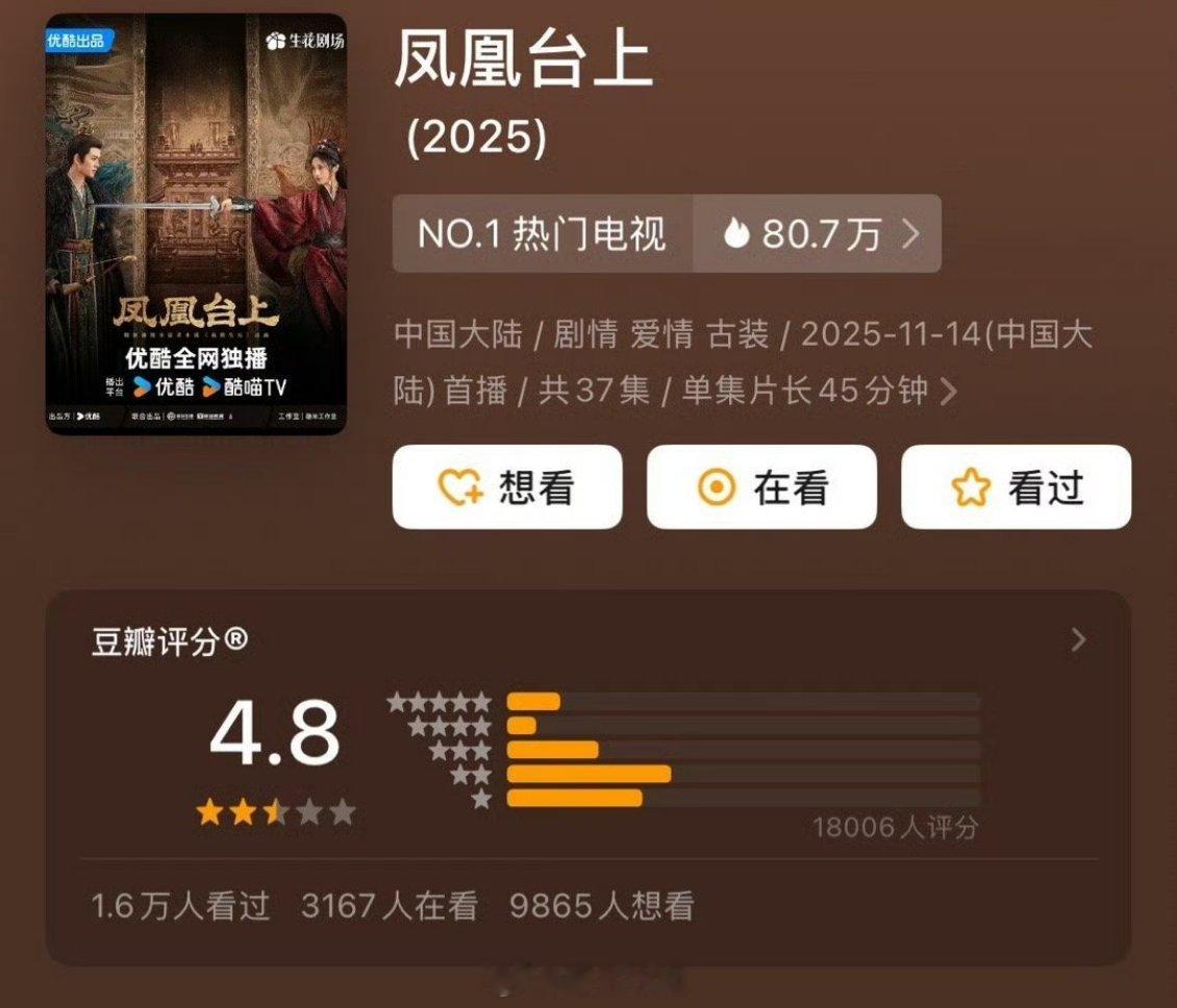 任嘉伦、彭小苒《凤凰台上》豆瓣开分4.8