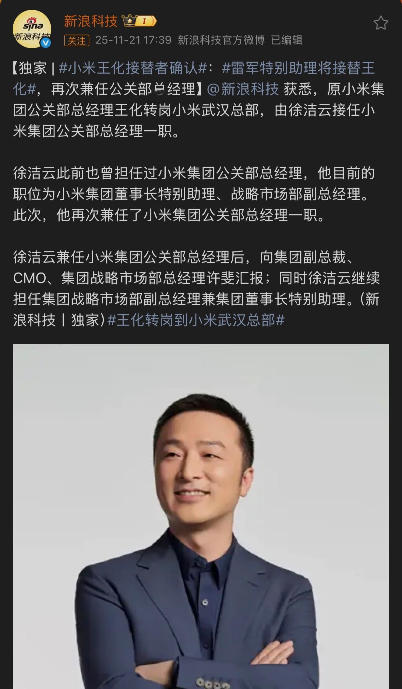 王化调岗去武汉后,徐洁云接替成为小米公关部总经理