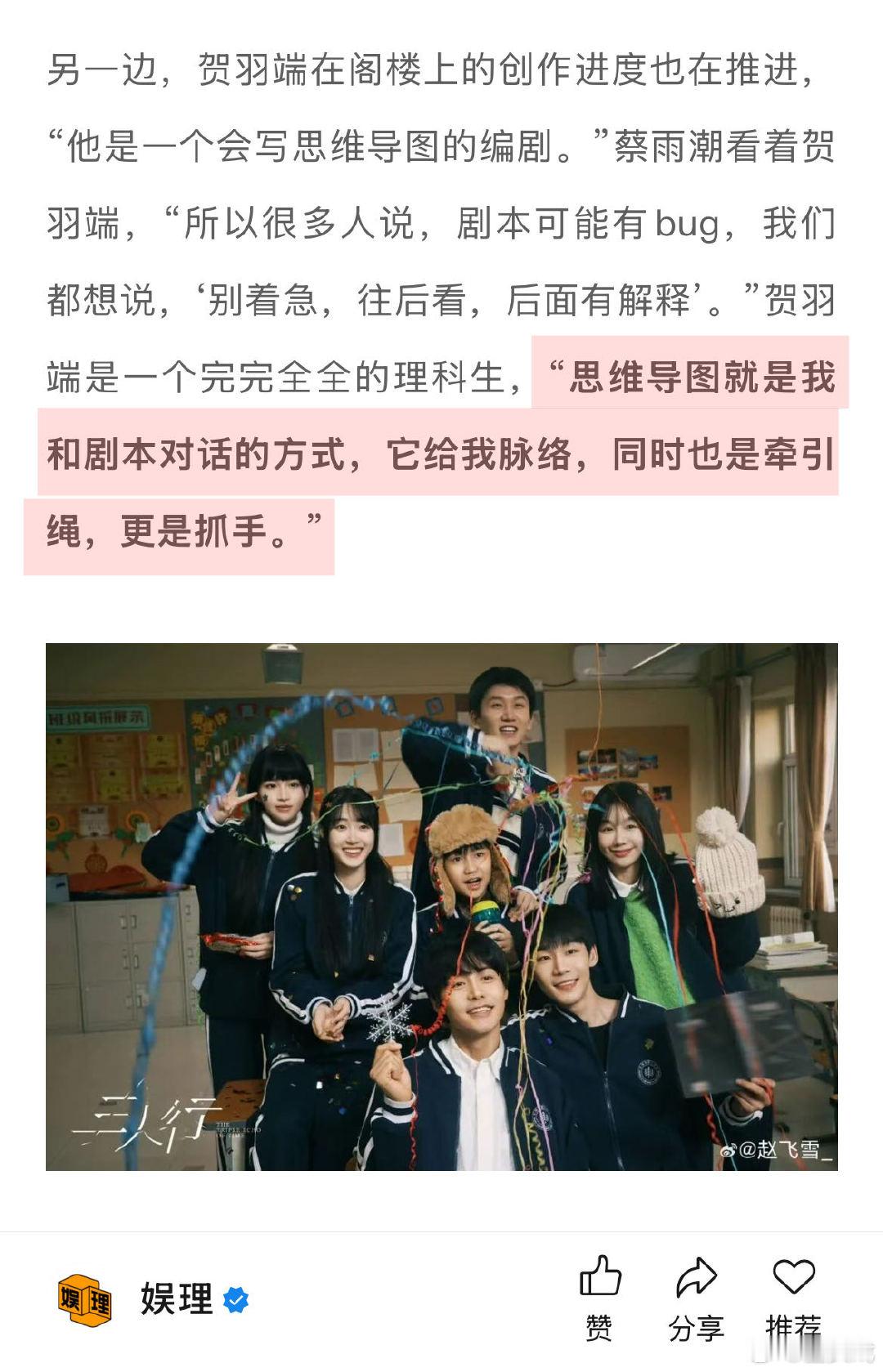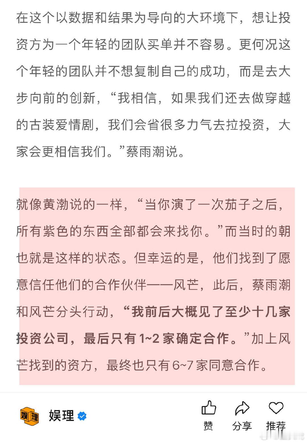 据《三人行》主创透露:“当时我们聊了一家,也算是朋友愿意帮忙,贺羽端答应给对方写30集的剧本,用未来的片酬来抵押。”此外,朝也影视的全部员工参与这部剧都没有任何酬劳的,这部分钱全部按照比例加入了前期的投资款中。算上借款、片酬参投等,朝也的投资比例逐渐走高,成为第一出品公司,背起了最大的风险。↓