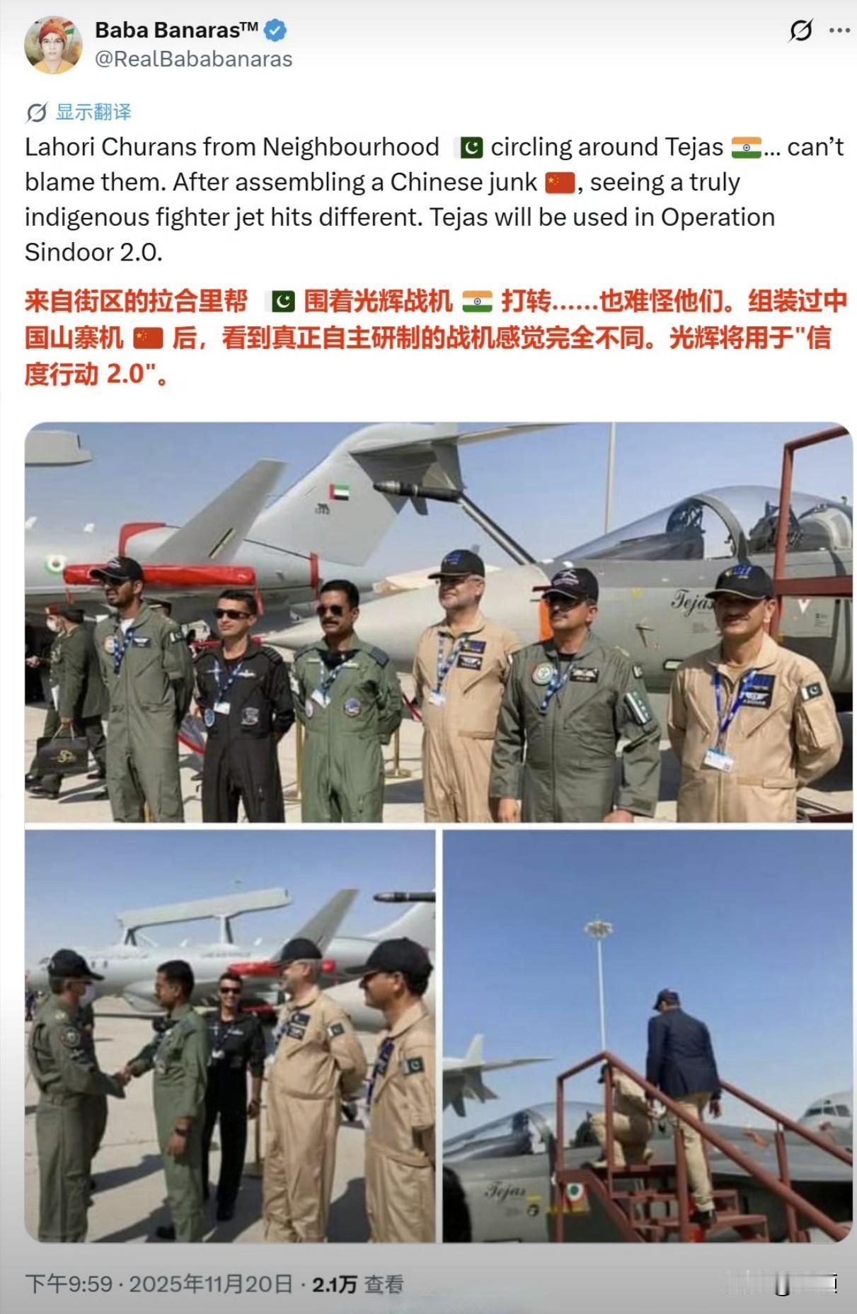 印度光辉战机表演时坠毁!2025迪拜航展最后一日突发意外,印度国产“光辉”战机在飞行表演中坠毁,现场燃起浓烟并伴随剧烈爆炸,后续表演随即中止,飞行员因伤势致命未能弹射逃生。 据悉,早在航展期间的11月18日,就有现场人员发现该参展战机下方持续滴落液体,地勤人员虽放置黄色纸箱承接,但印度军方辩称滴落物为冷凝水,未对这一疑似漏油的故障预警予以重视。作为印度耗时33年研制、2016年正式服役的第三代战机,“光辉”战机被视为该国自主国防制造的重要象征。 在事故发生前,印度军迷还在推特上嘲笑巴基斯坦用的是“中国山寨战斗机”。 事故发生后,他发了个“心碎”的表情,看来受到挺大的打击。