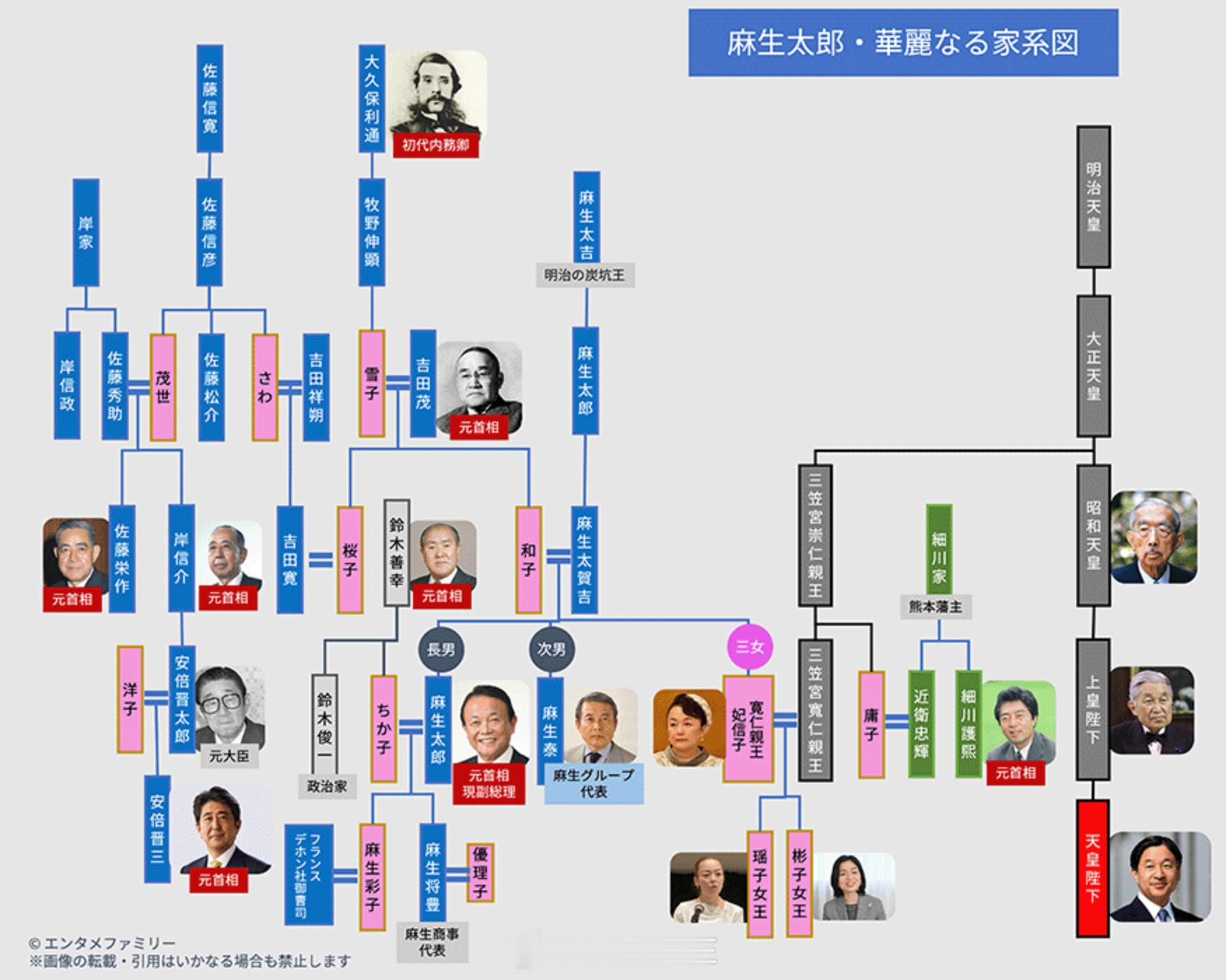 好家伙,高市早苗的背后,居然还是这么一层关系。众所周知,高市早苗这次能当上日本首相,就是麻生太郎在背后支持的。麻生太郎,是自民党内部最大的右翼势力,而麻生太郎的身上,就更搞笑了。麻生太郎的亲爷爷也叫麻生太郎,日本人是真的把X本人发挥到了极致。麻生太郎的三妹,是日本三笠亲王的老婆,是当今令和天皇的远房表婶。而麻生太郎它娘,和安倍晋三的爷爷,是同外婆下面表弟媳的妹妹。安倍晋三,论辈分,得喊麻生太郎一声……叔?好乱,日本的高层,实际上也是一群靠血缘关系维系的门阀世家。名侦探柯南的贝克街的亡灵,就已经将日本门阀世家的表皮给撕开了。