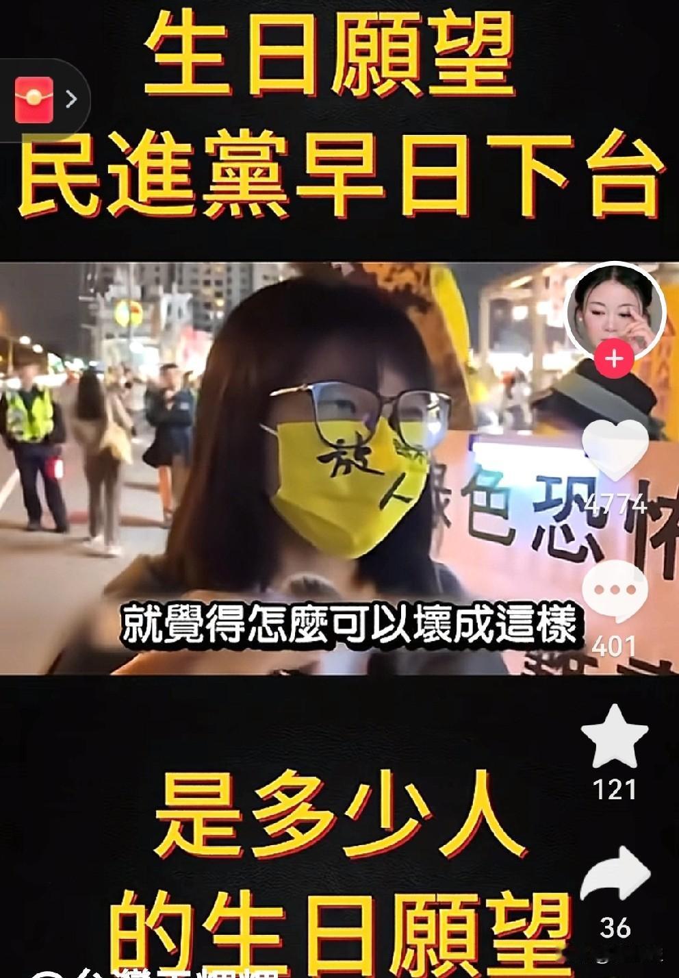 台湾同胞有人清醒了吗?这位女士就是其中的一个。她说她爸妈都是深绿,她也是两次投票给蔡英文,而她现在过生日的愿望竟然是民进党赶快下台,给台湾一个干净的政治空气。这真是有所谓的对比。继续独化,只能是恶化。就像小本子给自己找事一样,亮底牌的越早,我们越好提前做出预判和充分准备。一举解决。