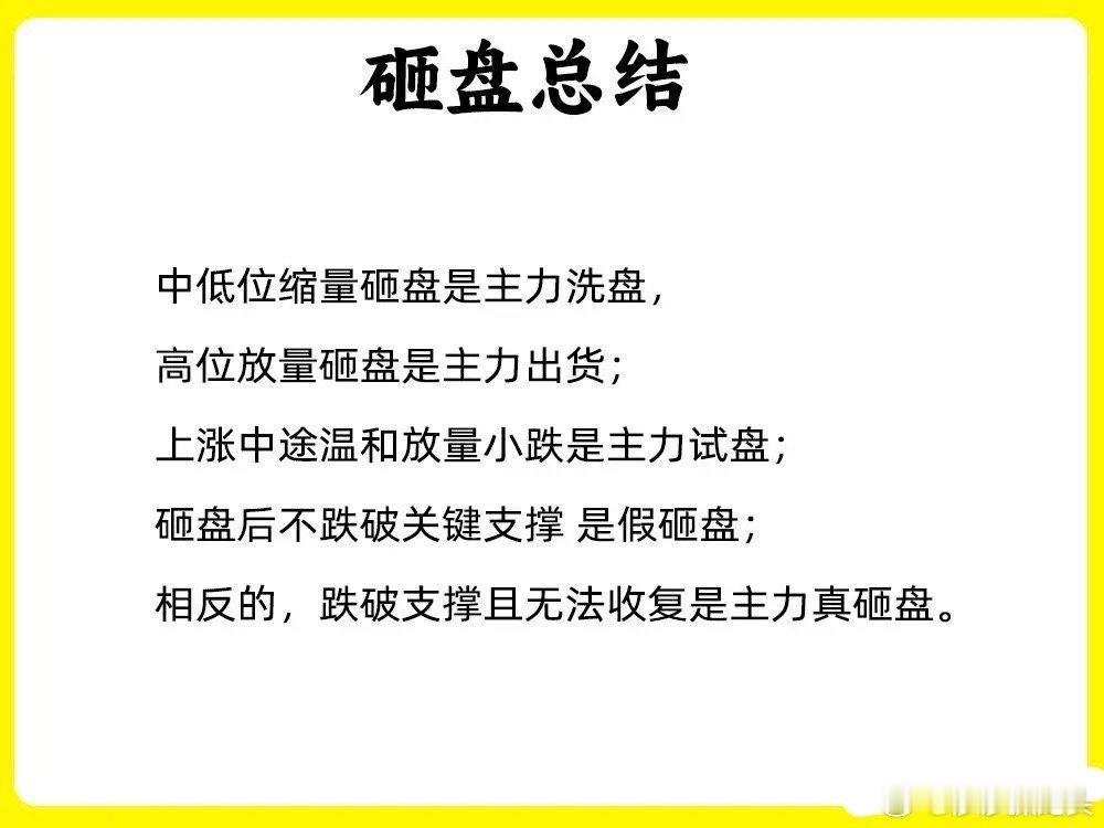兄弟们注意了!困扰散户的千古难题就被这三个模型给破解了!很多散户看到主力砸盘就会第一反应就是以为主力出货了!如果你也是这么认为,那这期内容就一定要认真看完。主力砸盘未必就是出货,莎莎给大家总结了砸盘的目的,一共有三种,一种是为快速出货,第二种是快速打压洗盘,还有一种是试盘,测试下方支撑力量。当然同样的砸盘,打压股价,在形态和逻辑方面是天壤之别。只要我们理解背后逻辑,我们就知道主力的真正意图。一、砸盘式洗盘在位置上来说,这种砸盘,股价位置一般会是低位,上涨趋势的初期或是长期横盘的阶段,股价故意打压股价,让股价跌破横盘的整理区间其次,下跌的阶段成交量情况,成交量不会太大,可能出现缩量,这是因为主力惜筹,筹码交换的是散户。而且,股价下跌的过程里,不会跌破重要的支撑位,那怕跌破,也能在短时间里快速收回。这种砸盘的洗盘不管是日K线里还是分时图中,出现的概率还是很大,尤其是早盘三十分钟里,尤其明显。二、砸盘式出货在股价位置来说,主力出货,一般股价已经经过长时间的上涨以后的高位,主力有一定获利,上涨幅度起码会在50%以上。股价这样大幅下跌,速度比较快,幅度比较大,所以在成交量的表现里,往往是成交量是上涨阶段里最大的量。而且,像我们常用的均线支撑,在股价下跌的过程里,快速跌破,没有多少反抗,最经典的形态就属断头铡刀形态了。这是主力不惜成本的出货,抛压很大三、砸盘式试盘之前我说过,主力的试盘位置有很多,像这种砸盘式试盘,一般是股价长期横盘的低位或是上涨趋势的初期,股价故意打压股价,是为了测试下方的支撑力量。这种形态在分时图中会比较明显,股价快速下跌,成交量温和放大,并没异常放大,股价止跌以后能快速回升,就形成了带长下影线的K线,下影线越长,说明下方支撑力量就越强。如果此时承接力量很弱,那主力可能就会继续洗盘。所以我们看到主力砸盘,我们得明白他的目的,才能从容应对。莎莎总结的这几句话,大家一定要牢记中低位缩量砸盘是主力洗盘,高位放量砸盘是主力出货;上涨中途温和放量小跌是主力试盘;砸盘后不跌破关键支撑 是假砸盘;相反的,跌破支撑且无法收复是主力真砸盘。就这五句话,小白也能轻松看懂。希望莎莎这期内容能给大家带来帮助或者启发,大家点赞,评论,➕关注就是对莎莎最大的支持