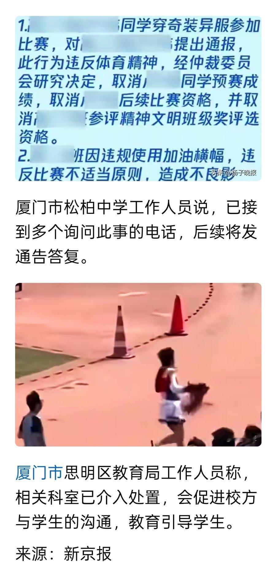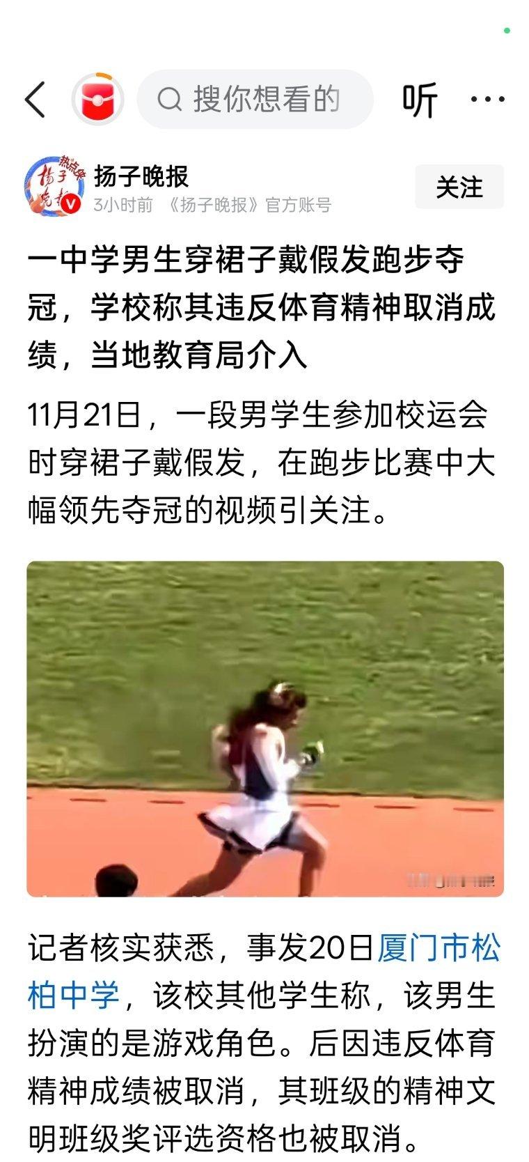 一中学男生穿裙子戴假发跑步夺冠,学校称其违反体育精神取消成绩,当地教育局介入