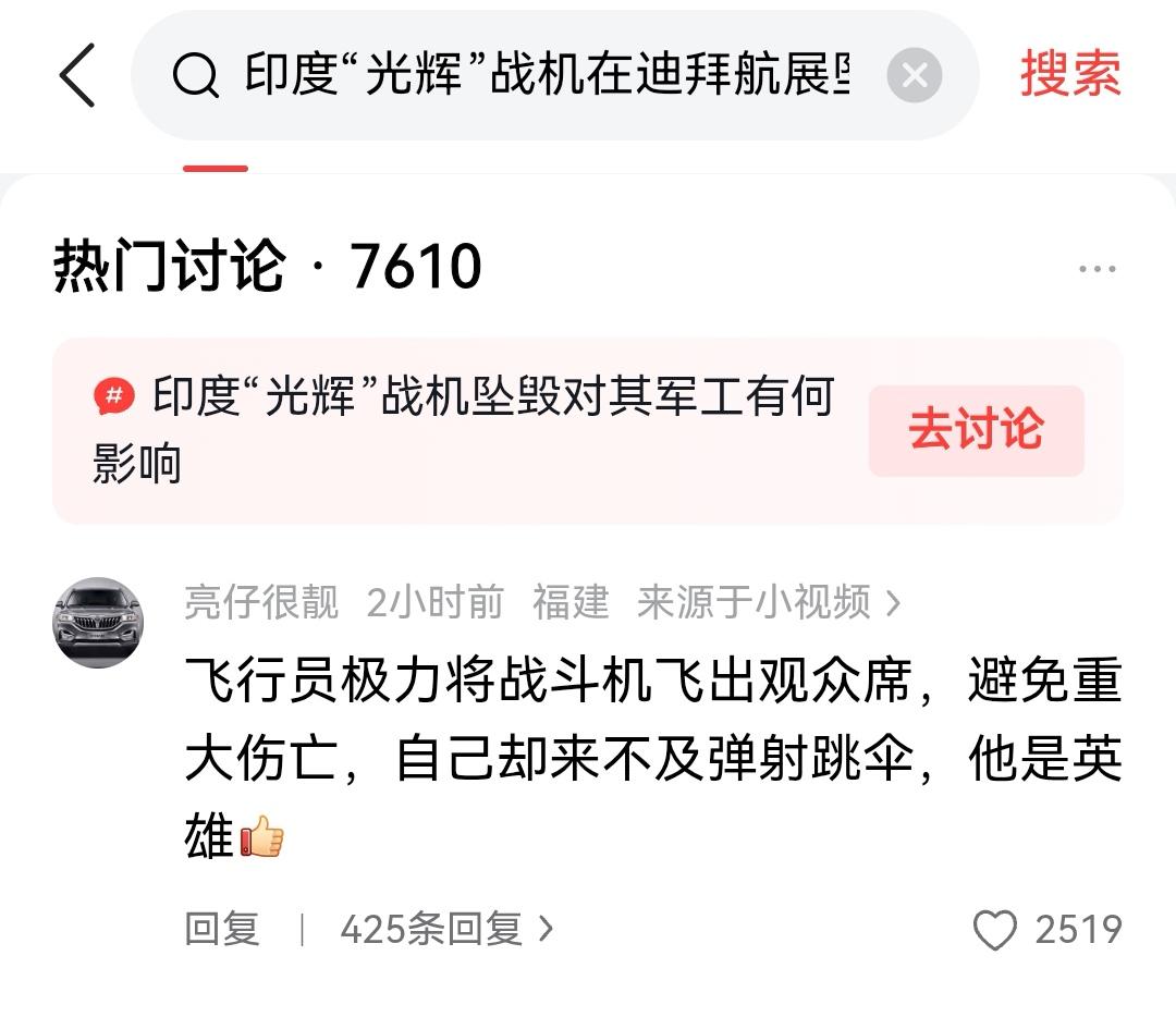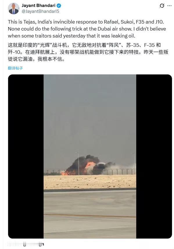 印度光辉战机迪拜航展坠毁,头条最热门评论居然是替印度丧事喜办,硬吹飞行员挽救观众席,是英雄!这条评论的赞数还在迅速增长中。 哪怕印度人都想不到这么洗,印度人洗的方法是狂刷F16坠毁的视频。 印度大V贾扬特班达里虽然又在阴阳怪气,但提到了一件事情:这架战机昨天漏油了,据说是本没打算飞行表演,漏油后才临时决定表演。