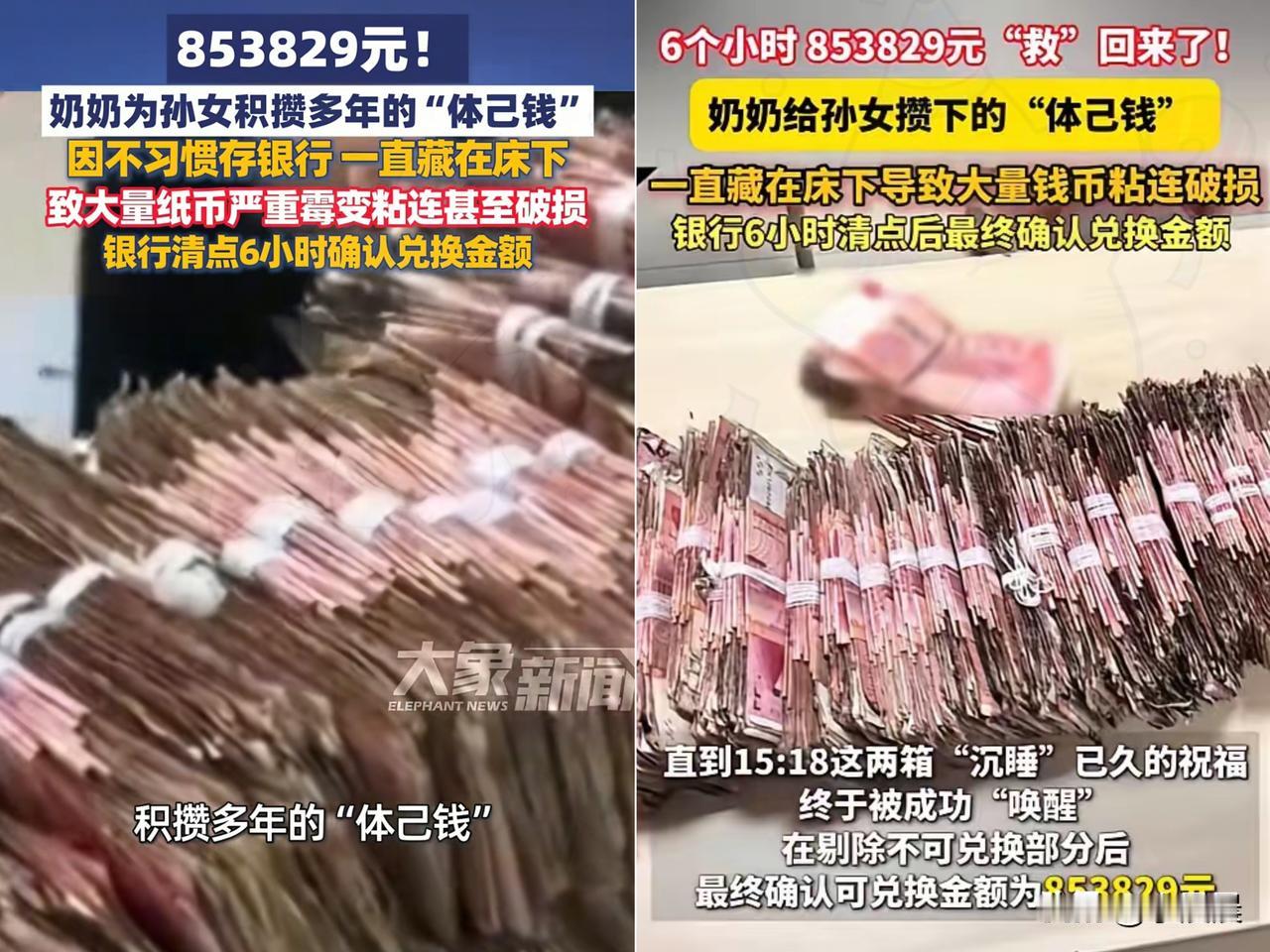“悲剧差点就成定局!” 江苏一老太省吃俭用攒下巨款, 藏在床底纸箱,本想等孙女结婚时 送上惊喜,结果纸币因潮湿严重发霉,几乎成了“霉砖”。 好在银行工作人员超负责,花了6小时耐心清点,最终兑换了85万多元。 这事儿背后,是奶奶沉甸甸的爱,也暴露出老一辈的存钱观念问题。 他们经历过苦日子,对银行不信任,觉得钱放身边才安心,可这风险太大了,发霉只是其一,还有火灾、虫咬、被盗等隐患。 咱作为子女,真得帮老人更新存钱观念了。 别硬邦邦地否定他们,而是用他们能接受的方式,讲讲存银行的好处,比如安全还有利息。 大家说说,你家老人是不是也这样存钱呢?