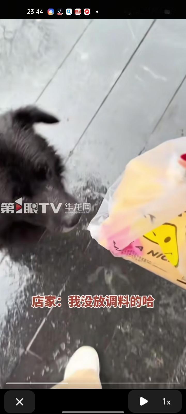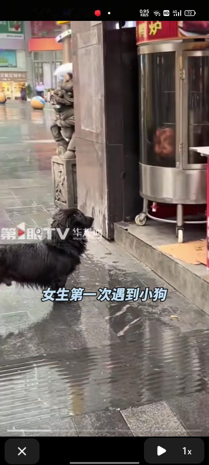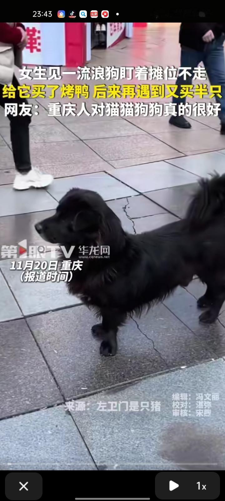11月17日(事发),重庆。女生看见流浪狗盯着烤鸭摊位不走,就给它买了烤鸭,狗吃完烤鸭后,把袋子扔进垃圾桶了。过了几天,女子出门又遇到那只流浪狗,又给它买一盒烤鸭,还给她盛了水。