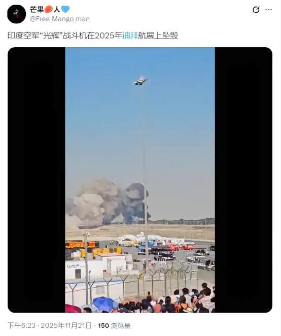 突发!迪拜航展最后一天,印度“光辉”战机发生坠毁! 当地时间下午2点左右,出席迪拜航展的印度“光辉”战斗机,在一次飞行表演中,突然出事坠毁了,现场一片火光。 “光辉”战机坠毁那一刻,烧掉的不只是飞机和飞行员,还有印度三十年来拼命想点亮的“国产航空梦”。 你说,一架价值上亿美元、代表国家工业门面的战斗机,起飞前靠购物袋接漏液,这事儿听着像不像段子?可它真发生了。 就在2025年11月21日下午,迪拜航展的天空原本属于表演与荣耀。轮到印度LCA“光辉”战机登场时,观众期待的是炫技与突破。结果,这架飞机在低空转弯时姿态突然失控,头朝下扎向地面,轰然爆炸。火光冲天,浓烟滚滚,飞行员没来得及弹射——人没了。 这不是“光辉”第一次出事。去年3月,一架同型号战机在训练中因故障坠机,飞行员跳伞生还。那次还能说是“有惊无险”。但这一次,是在全球媒体镜头前,在多国军方代表注视下,当着全世界的面,摔了个粉身碎骨。 更讽刺的是,出事前四天,同一架飞机在静态展示区被拍到机翼根部不断滴落不明液体。地勤人员不是抢修,而是用吸水垫、超市塑料袋、甚至礼品包装袋去围堵。视频传开后,印度官方轻描淡写回应:“那是空调冷凝水。”可航空圈谁不知道?冷凝水不会从机翼结构缝里渗,更不需要拿购物袋接。国际专家普遍推测,那极可能是燃油或液压油泄漏——直接关系到飞行控制的核心系统。 如果真是这样,那问题就大了。一架存在明显技术隐患的飞机,不但被允许参展,还被安排执行高难度飞行表演。这不是勇敢,是拿人命赌国运。 “光辉”项目从1983年立项,到2016年服役,整整33年。中国歼-10首飞用了21年,从歼-6一路摸爬滚打过来,每一步都扎扎实实。而印度呢?号称“自主研发”,但发动机是美国的,雷达是法国的,航电是以色列的,连弹射座椅都靠进口。整架飞机就像个“国际零件展览会”,拼起来能飞,但系统兼容性、稳定性、品控标准,全靠运气。 这不是技术问题,是发展模式的问题。 你可以说印度想弯道超车,但造飞机不是拼乐高。子系统之间不匹配,软件逻辑打架,一个小故障就可能引发连锁反应。这次坠机发生在低空机动改出阶段,很可能是飞控响应延迟或液压失效,导致飞行员无法及时修正姿态。而这种问题,往往在地面测试中难以完全暴露,只有在极限飞行时才会爆发。 再看国际影响。原本,“光辉”是印度军贸的“新名片”,正跟阿根廷、越南等国谈采购。可现在呢?社交媒体上全是“购物袋战机”的梗图,有人说它看到巴基斯坦的“枭龙”来了直接吓尿。玩笑背后,是信任崩塌。一架连自己人都不敢全信的飞机,谁还敢买? 印度空军自己也心知肚明。今年5月印巴空战,“光辉”全程没参战。不是它多先进躲过了雷达,而是压根没被派出去。相比之下,中国歼-10C已经实现出口,成飞的生产线排到了2030年。 我不是说印度不该搞自主研发。恰恰相反,一个大国必须有自己的航空工业。但前提是:得实事求是,得尊重科学规律,得有耐心。不能为了政绩赶工期,不能为了宣传压问题,更不能拿飞行员的生命去填补技术短板。 “光辉”两个字,本意是照亮前路。可当它在迪拜的天空坠落时,照出的却是浮夸、侥幸和系统性的失序。 如果印度真想让国产战机飞得更高,第一步或许不是再砸几百亿追加订单,而是停下脚步,把那架漏液的飞机拆开,一寸一寸地查,从螺丝到代码,从设计到管理,真正搞清楚——我们到底差在哪? 只有直面问题,才有可能迎来真正的“光辉”。 各位读者你们怎么看?欢迎在评论区讨论。