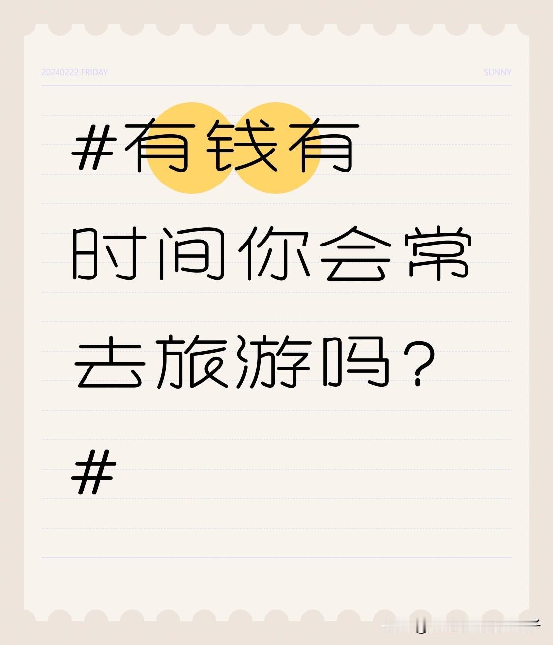 有钱有时间你会常去旅游吗? 有钱有时间,那必须常去旅游啊!旅游能让人开阔眼界,去领略不同地方的自然风光和人文景观。想象一下,在海边看日出日落,在古老小镇感受历史韵味,多惬意。 很多人总说等有钱或有时间再去,可有钱时可能没时间,有时间又没钱,等两者都有了,身体又不一定行。人生苦短,别留遗憾。有机会就出门走走,看看世界的多样,体验各地的文化和风俗,丰富自己的人生阅历。别犹豫,旅游就趁现在!