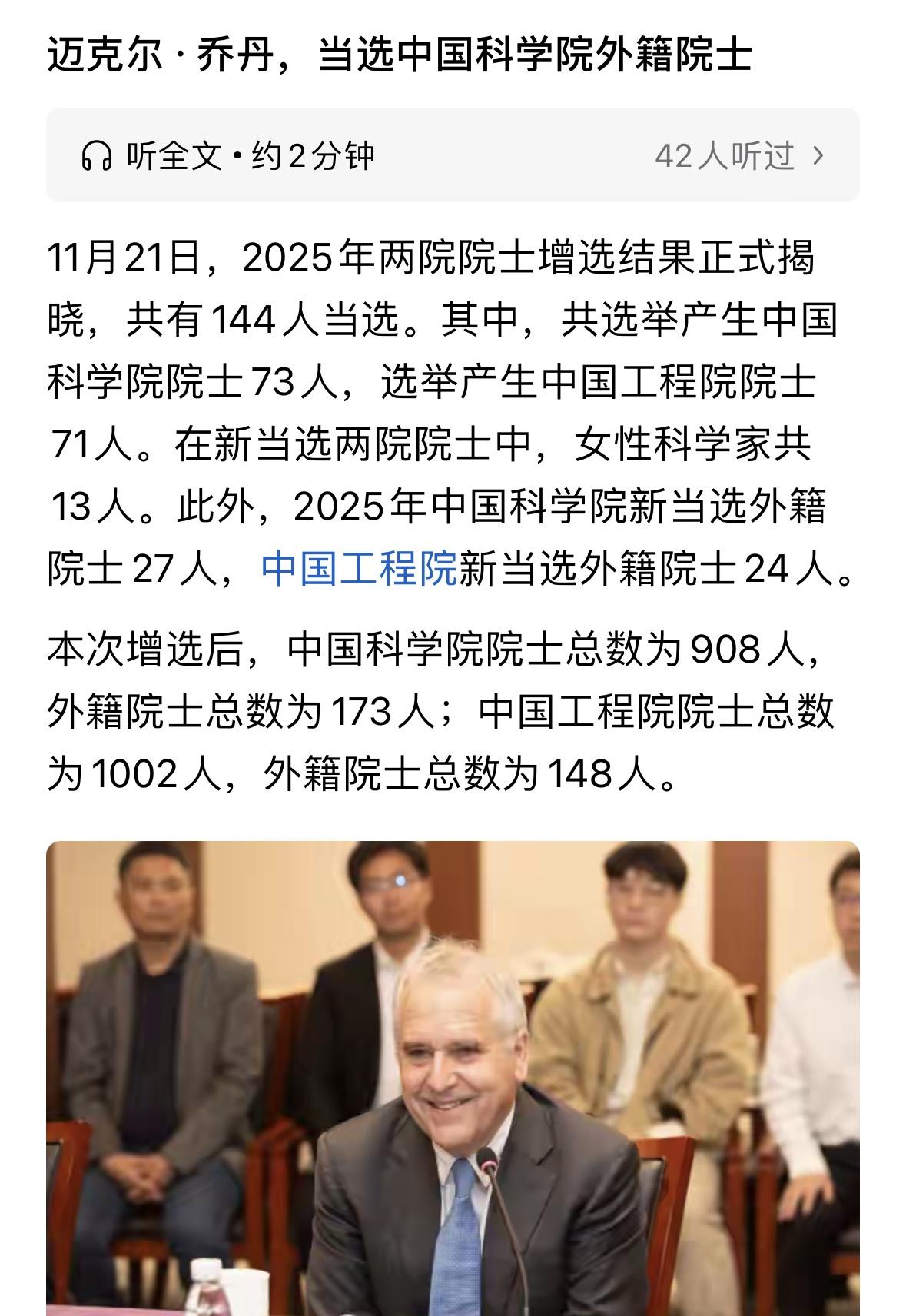 迈克尔·乔丹,当选中国科学院外籍院士 11月21日,2025年两院院士增选结果正