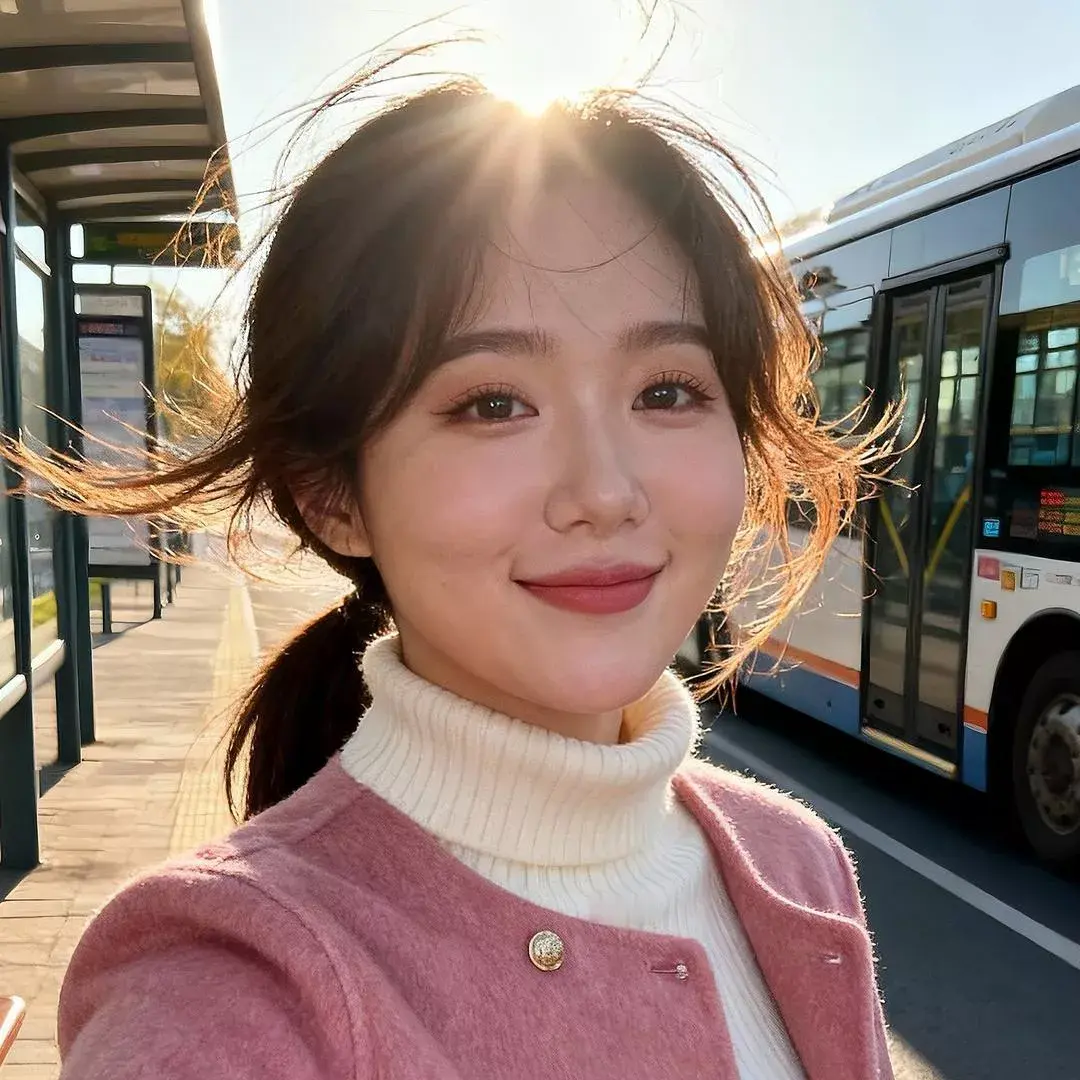 阳光明媚的一天,元气少女在公交站前微笑自拍。少女感微笑女孩 甜系少女照 阳光少女照 明媚自拍 明媚拍照姿势 公交上的美女 地铁少女自拍 地铁自拍女