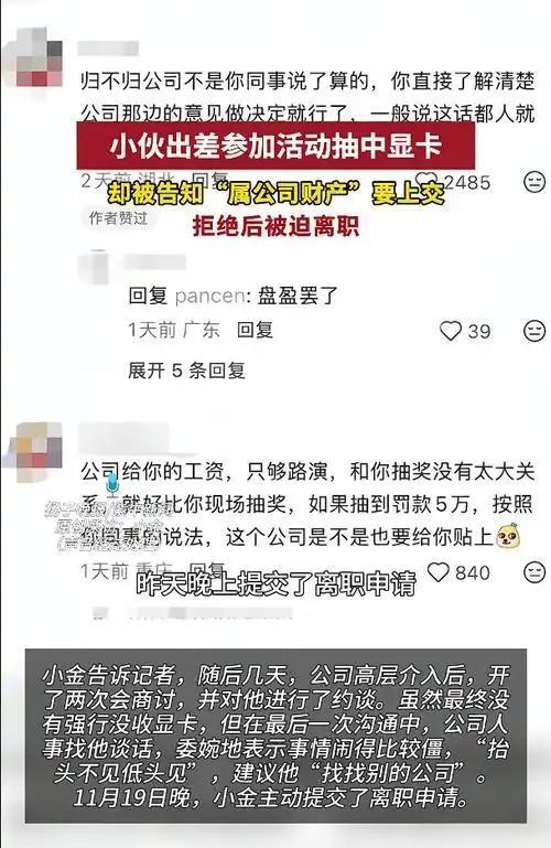 这事儿真是够奇葩的。上海一个实习生小金,被公司派去参加英伟达的路演,结果手气爆棚抽中一张三千块的显卡——本来挺高兴一事儿,转头公司就找上门,说他是“代表公司去的”,非让把显卡上交。 这不离谱吗?人家自己抽的奖,一没占工作时间二没用公司资源,全凭个人运气,你一句“代表公司”就想白嫖?说白了就是眼红,想占便宜。 小金也没怂,跟公司来回扯了几轮,结果对方死活不松口。行,那我不干了总行吧?11月20号他直接提了离职,显卡揣自己包里,转身走人。 要我说,干得漂亮。现在有些公司就是惯的,啥都想要,连员工的手气都想收割。你是发他工资了,但没买断他的人品和运气吧?这种明显属于个人所得的奖品,公司硬要占,吃相实在太难看。 咱打工人上班是来挣钱的,不是来当软柿子捏的。碰上这种不讲理的要求,忍一次就有下一次。该刚就得刚,大不了换地方。反正年轻,有手有脚有本事,哪儿还找不着一份工作? 支持小金的选择。不是所有“公司要求”都合理,有些规矩,活该被整顿。