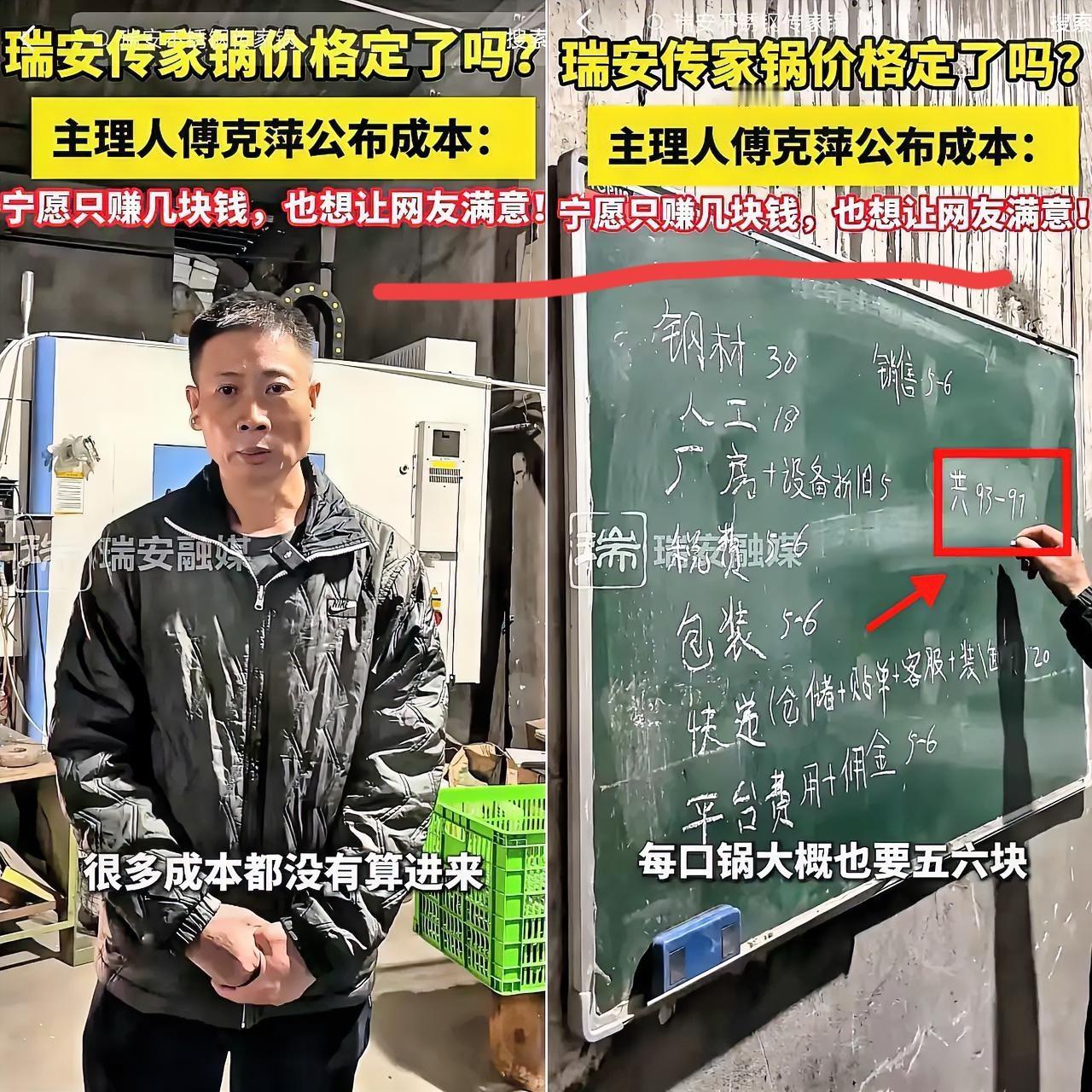 瑞安传家锅的价格出来了 可能要让很多人失望了! 因为一开始说50多的时候有很多成本没有考虑进去,比如包装、物流、平台佣金这些隐形成本这么高! 48元钢材人工+40多杂费税费,成本都快破百了,最后咬着牙定99元,基本没利润还不肯提价,就怕辜负蹲单的网友! 现在市面上的锅真的太乱了,要么是不知名材质卖天价,要么低价货用着担心重金属超标。这口锅敢标食品级304不锈钢,还把中间环节砍了透明成本,这份实在比虚头巴脑的低价靠谱多了! 99元买口用料扎实、老板还肯扛成本的锅,真的不算贵吧? 你觉得这价格值得冲吗?如果是你,会愿意为这份实在买单吗?