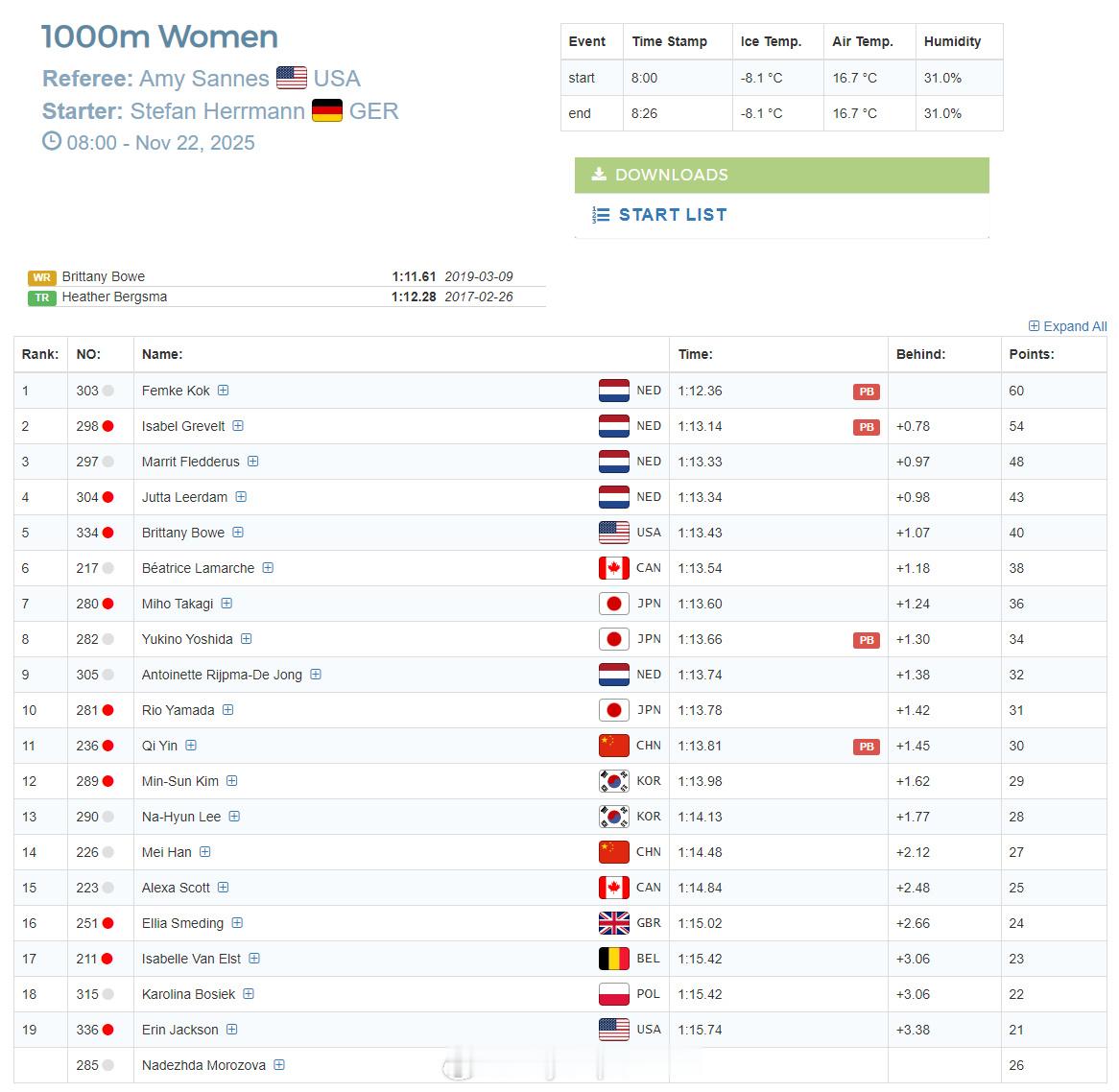 【速滑世界杯廉子文1000米第5 宁忠岩列第15】 11月21日,速滑世界杯加拿大卡尔加里站揭幕。在男子1000米比赛中,美国名将斯托尔茨以1分06秒整夺冠,荷兰德波和文内马尔斯分获银铜牌。中国选手廉子文以1分06秒73创造PB,取得第五名,宁忠岩排名第15。在女子1000米比赛中,荷兰实力超群包揽前四,科克以1分12秒36夺冠。中国选手殷琦和韩梅分列第11和14位。
