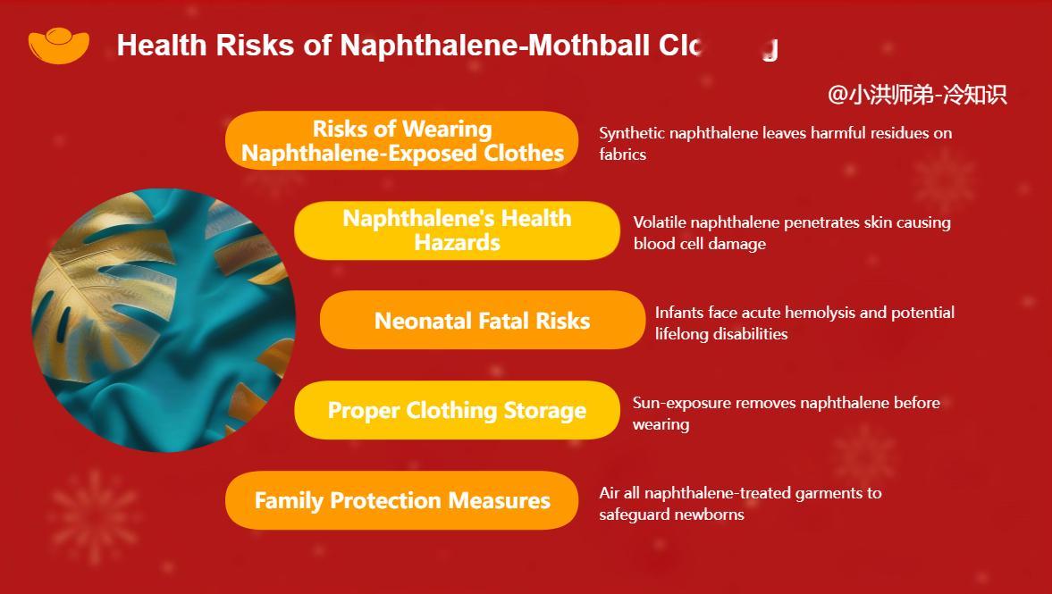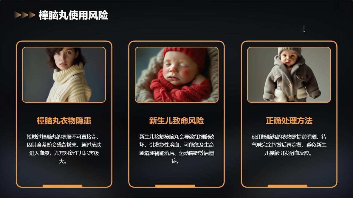 接触过樟脑丸的衣服可以直接穿有人习惯把衣服、被褥和樟脑丸一起存放,并喜欢直接穿接触过樟脑丸的衣服。其实樟脑丸是由人工合成的一种化学物质,放置后会留下大量粉末,夹杂在衣物上,接触过樟脑丸的衣服不可以直接穿。樟脑丸是家庭常用的防止衣服被虫蛀的物品,其主要成分是萘酚,具有强烈的挥发性。当人穿上放置过樟脑丸的衣服后,萘酚会通过皮肤进入血液。如果出生后不久的新生儿接触了樟脑丸,会使体内大量的红细胞被破坏,导致急性溶血,甚至危及生命,或留下不同程度的后遗症,如智能落后、运动障碍等。因此,存放新生儿的衣物时不要用樟脑丸。如果已经放了,则要在穿之前几天把衣服放在阳光下直晒,让樟脑丸的味道挥发掉。家人的衣服放置了樟脑丸后,拿出来穿之前也要晒一阵子,待樟脑丸的气味消失后再穿,以免新生儿接触后发生溶血。|||