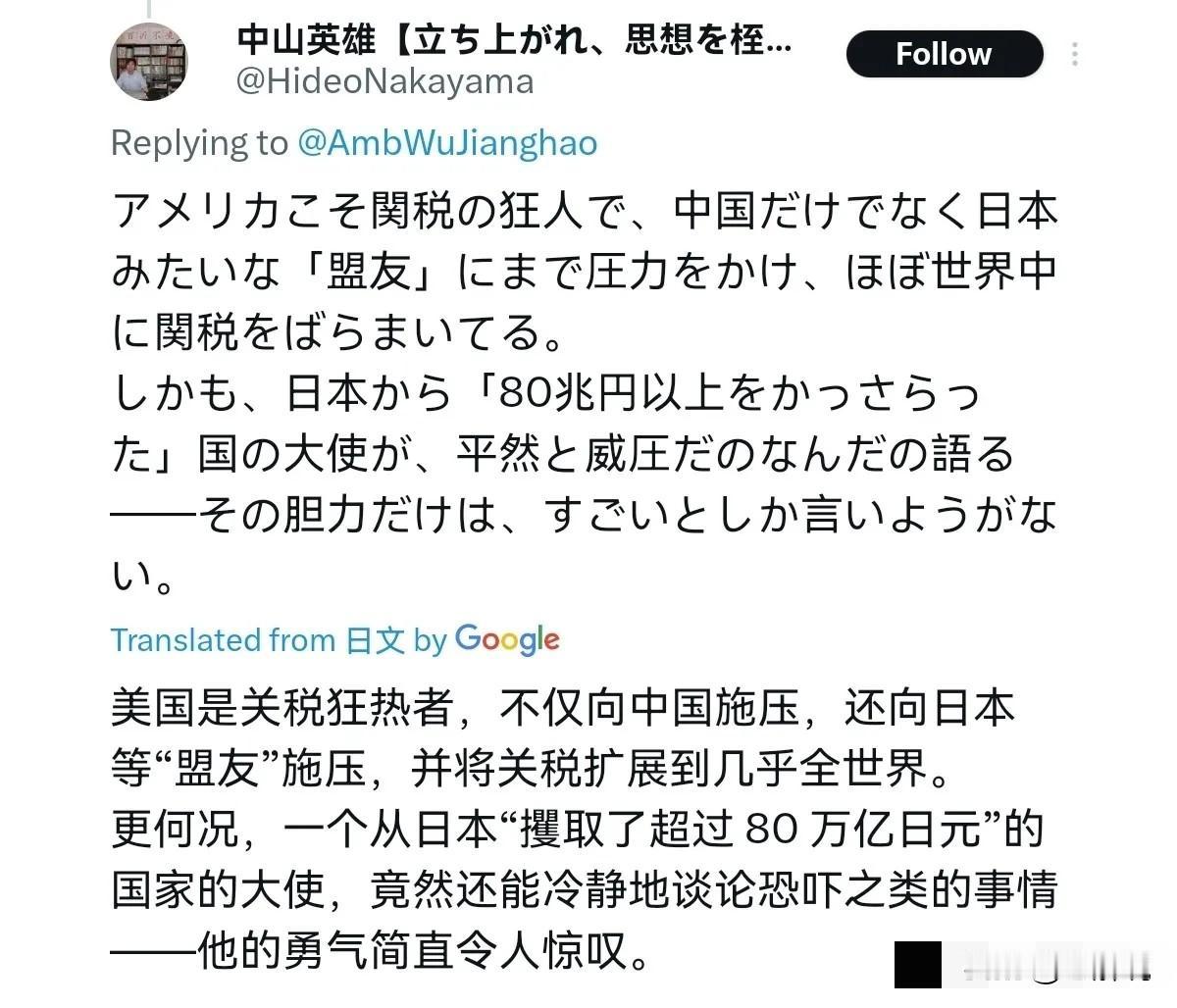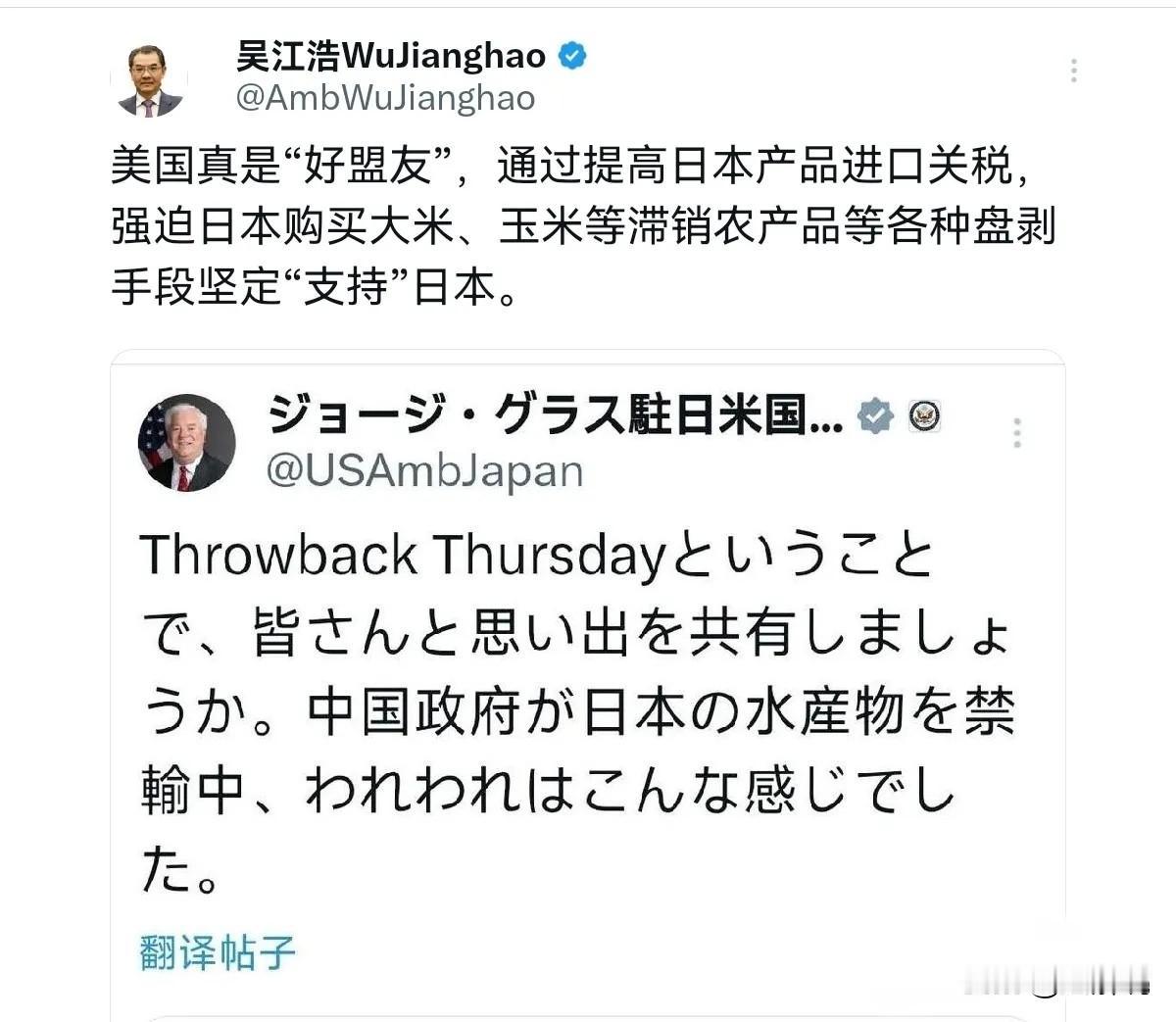 日本国内破防了!吴江浩大使一句话,捅了日本的肺管子,日本的亲美派都绷不住了!11月21日,在美国驻日大使挺日本之后,我们的吴江浩大使回敬称,美国真是“好盟友”,通过提高日本产品进口关税,强迫日本购买大米、玉米等滞销农产品等各种盘剥手段坚定“支持”日本。 吴江浩大使这次的回应的出了一个关键问题。他提到美国通过加征关税、强迫日本购买滞销农产品等方式“支持”日本,这其实是揭示了美日同盟关系中一种不太对等的一面。 美国驻日大使格拉斯此前曾站出来支持日本,但吴大使的回应直接指出了美国在背后对日本的经济盘剥,比如将日本汽车关税大幅提高,以及迫使日本高价购买其并不急需的美国农产品。 这种“支持”方式,难免让人想起基辛格说过的那句“做美国的敌人是危险的,但做美国的朋友是致命的”。 日本国内一些网友对此感到破防,可能是因为这种说法触动了他们内心深处的矛盾。 一方面,日本在安全上依赖美国; 另一方面,在经贸上又不得不承受来自美国的压力,比如关税壁垒和强制的农产品采购,这些都对日本相关行业造成了实际损失。 当这种看似矛盾的盟友关系被直白地指出来时,会让人更清晰地看到其中不平等的本质。日本夹在中美两个大国之间,确实处境比较尴尬,中国是它最大的贸易伙伴,而美国是它的安全盟友,这种平衡并不好把握。 所以在我看来,吴大使的回应是明确提醒日本,一味追随美国并触碰中国核心利益(比如台湾问题)并不会给日本带来真正的好处,反而可能让自己陷入更被动的局面。 这种直白的外交言辞,某种程度上也是希望日本社会能更清醒地认识到什么是自身真正的利益所在。 国际关系中,表面上的盟友承诺和背后的利益算计往往不是一回事,关键时刻可能还是自身利益优先。