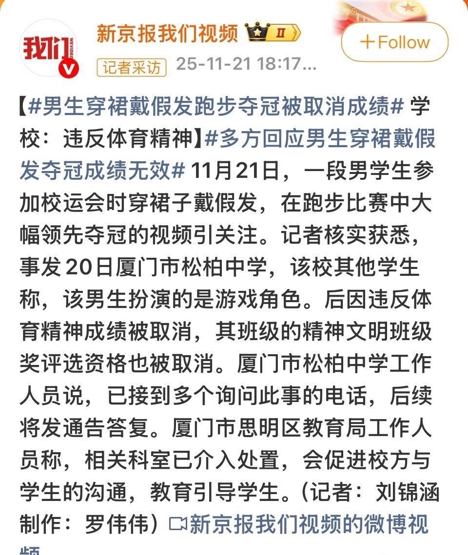多方回应男生穿裙戴假发夺冠成绩无效产生争议也很正常,因为缺少沟通。首先认定学生违反体育精神,违反在哪里?既没作弊也没歧视,只是个Cosplay去参赛。其次如果认定学生着装参赛不妥,那在起跑线上就应该指出,而不是冲过终点认定成绩无效。第三作为校运会应该是有规则和流程的,如果事先不明确,时候去处罚,受罚者不会心服口服,不能体现在规则下使用权力的原则,不利于教育和引导学生成长。