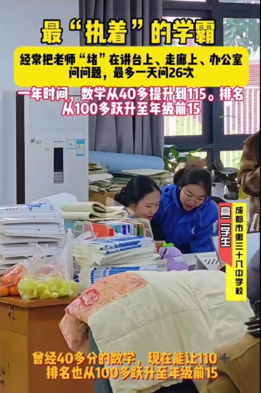 这位高二学生堪称最执着的学霸,最爱问问题的她,简直成了老师们的“专属小尾巴”。 讲台上,当老师刚结束授课,他便迅速围上去;走廊中,偶遇老师也绝不放过提问的机会;办公室里,更是常常能看到他虚心求教的身影。她说最多一天问了26次问题,这般求知若渴的劲头,实在令人惊叹。 功夫不负有心人,在这坚持不懈的努力下,他的成绩实现了惊人的飞跃。一年时间里,数学从40多提升到115,排名从100多跃升至年级前15,成绩蹭蹭往上涨,这变化简直比坐火箭还快,太让人震惊了。